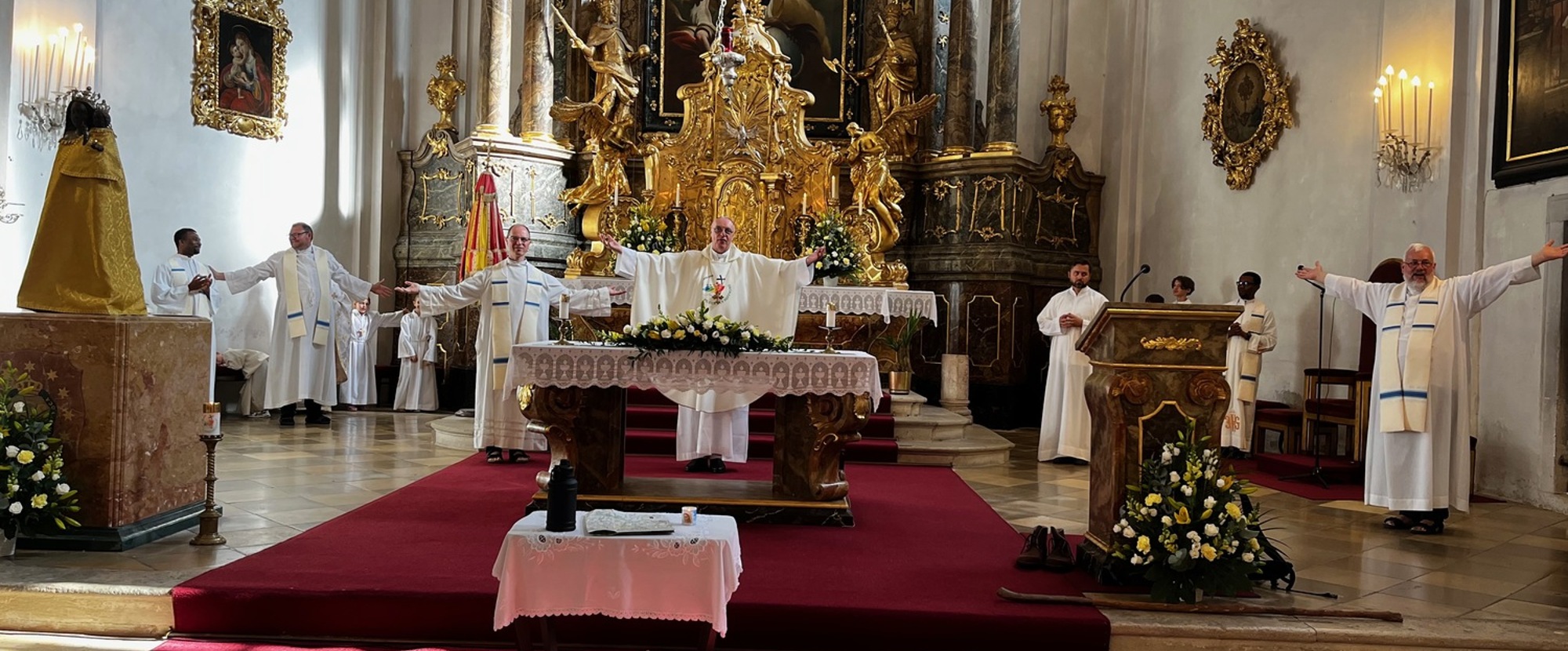 Zum Schluss hielt er einen Pilgerstab hoch und zog den Vergleich: "Ein Pilgerstab stützt uns, wenn der Weg anstrengend wird, und schützt uns vor Gefahren. In unserem geistlichen Leben ist Maria dieser Pilgerstab. Sie möchte uns an der Hand nehmen und zu Jesus führen, der das Ziel unserer Pilgerfahrt ist."
