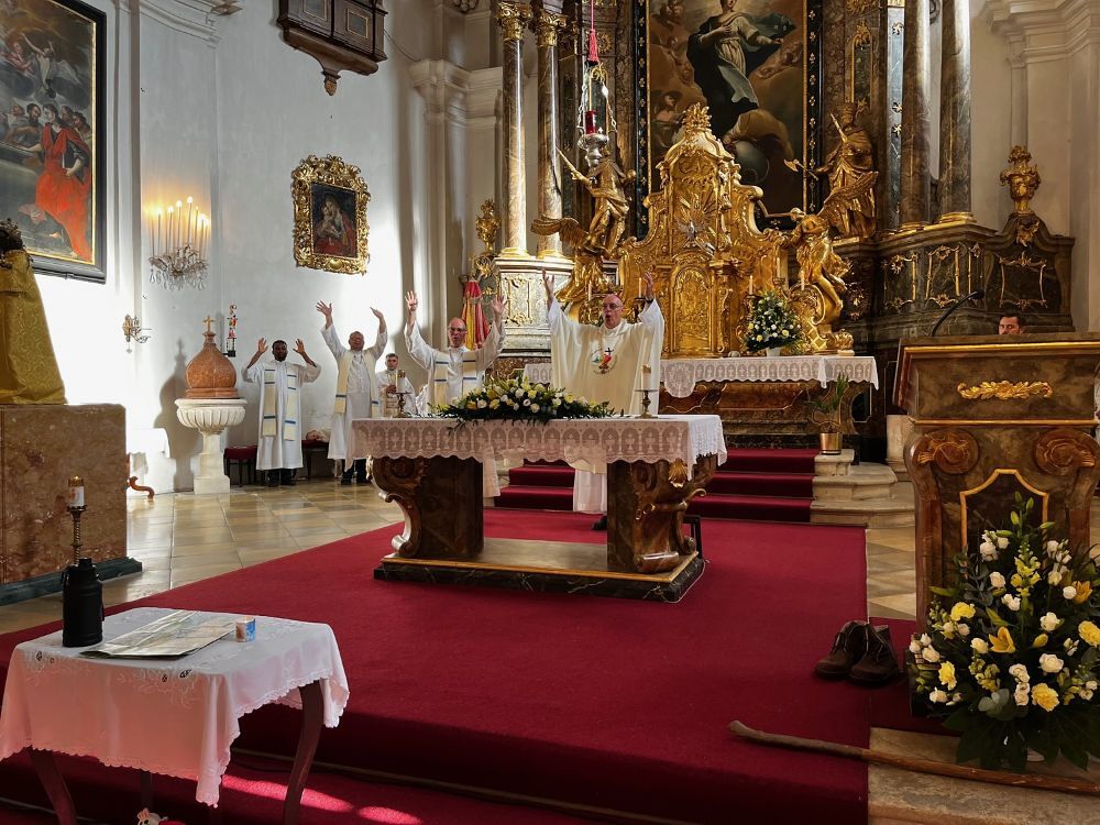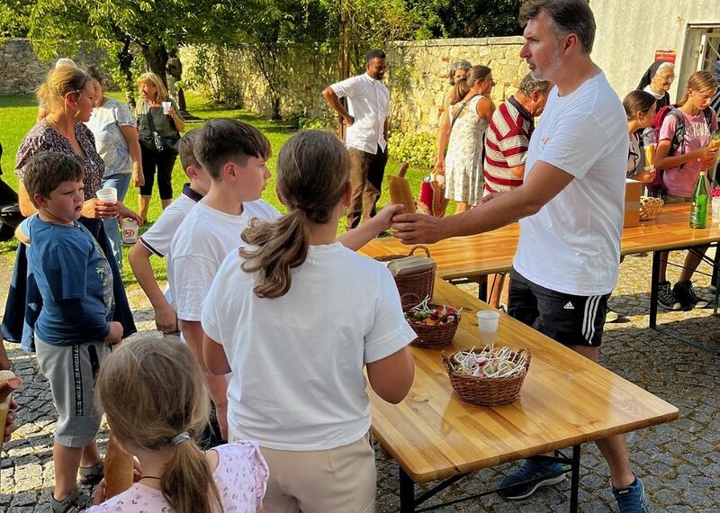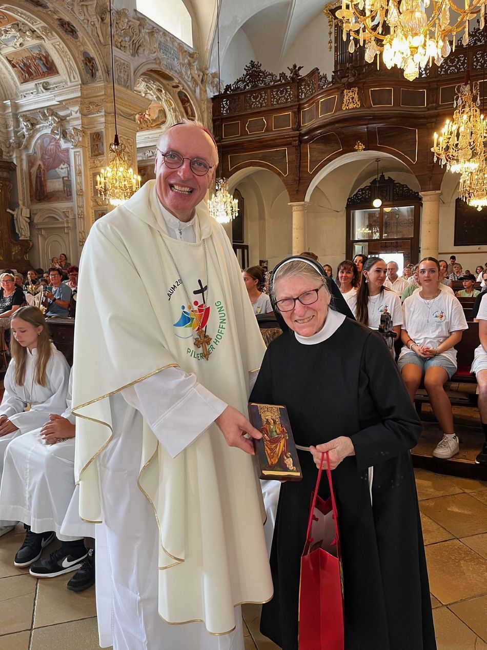 Bischof Zsifkovics begrüßte die Teilnehmenden herzlich: "Ich freue mich, dass so viele heute nach Loretto gekommen sind, obwohl ihr bei diesen Temperaturen auch im Schwimmbad sein könntet. Besonders danke ich Schwester Michaela Siffert, die seit 45 Jahren Patin dieser Wallfahrt ist." Als Zeichen des Dankes überreichte er Schwester Michaela eine Ikone des heiligen Martin. Gemeinsam mit ihrer inzwischen verstorbenen Schwester Magdalena hatte sie 1981 die Initiative zur Kinderwallfahrt ins Leben gerufen.