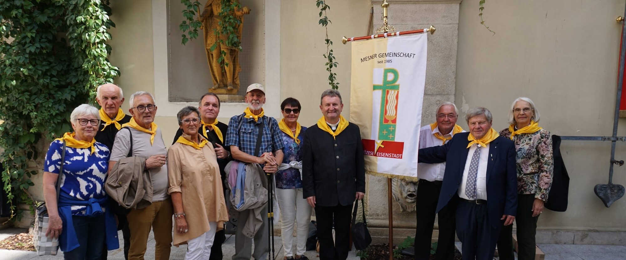 Das Treffen aller Pilger fand in der Franziskanerkirche im ersten Bezirk statt. Die Pilger aus dem Burgenland hatten ihre eigene Fahne dabei. Zwei Fahnen wurden zu diesem Anlass in der Kirche gesegnet. Der Leiter der burgenländischen Mesner Gemeinschaft, Rudi Csenar, war für die burgenländische Gruppe und alle organisatorischen Belange zuständig. In der Franziskanerkirche begrüßte der für die Mesner zuständige Bischof Dr. Hansjörg Hofer alle Anwesenden und sprach kurz über den Dienst der MesnerInnen, die ihn freiwillig, aus Liebe zu Gott, aus Glauben an Jesus Christus und aus Liebe zur Kirche leisten.