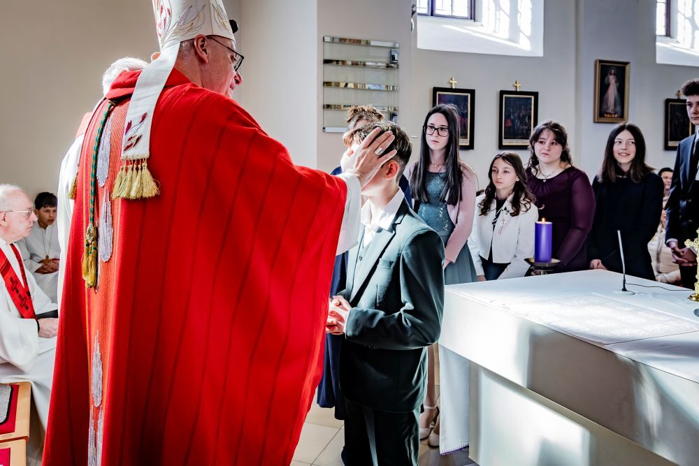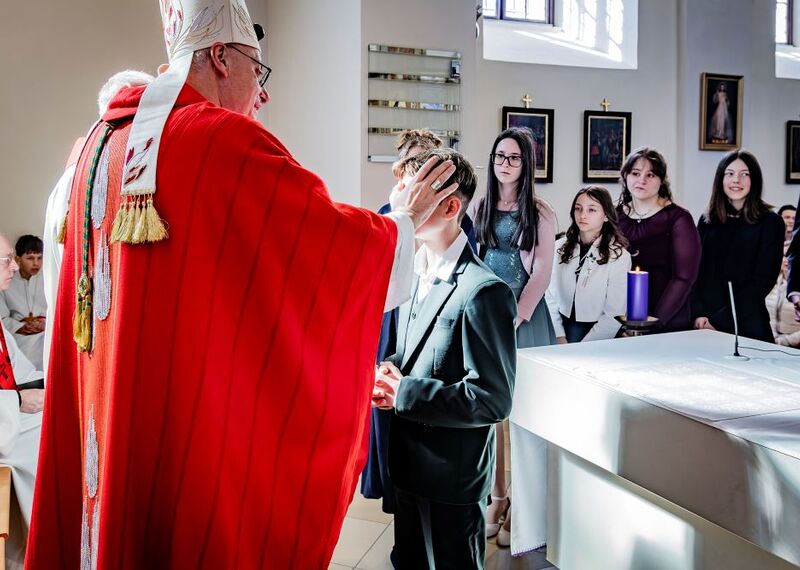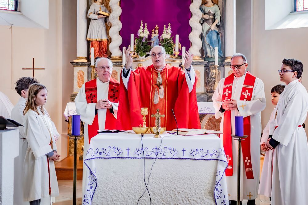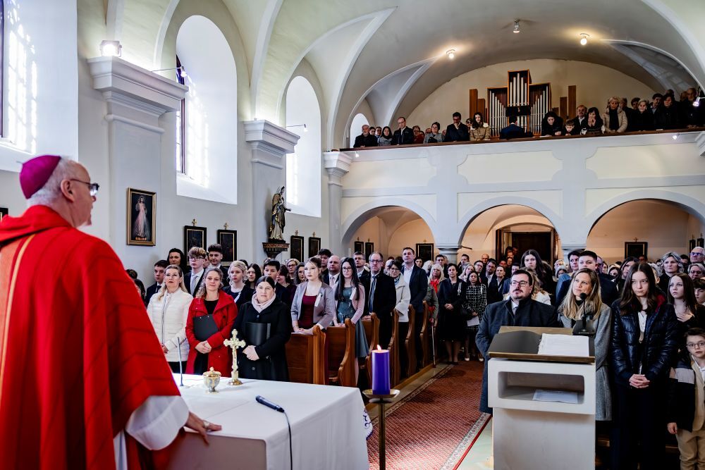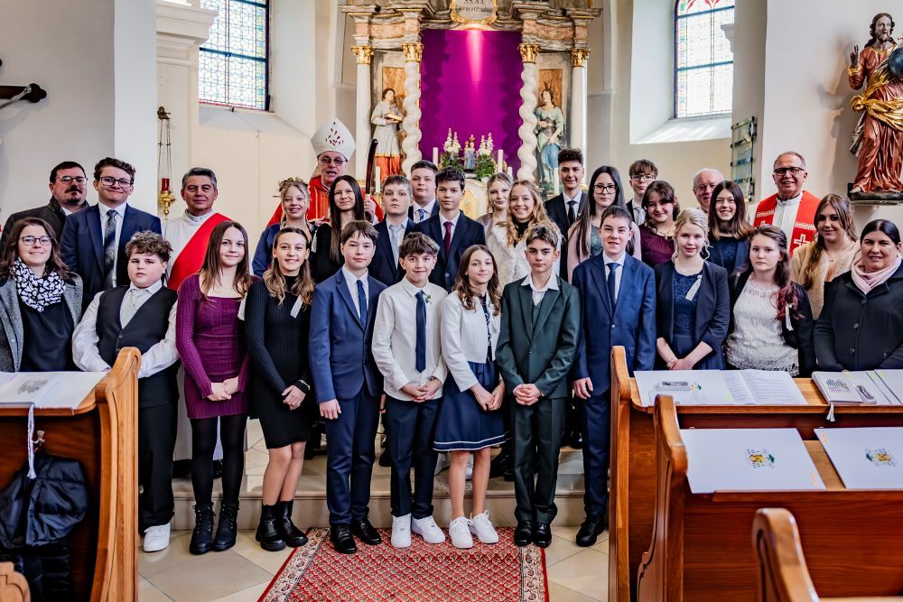 „Lasst den Geist nicht erlöschen!“ Drei Zeichen der Firmung sind: die Handauflegung auf deinen Kopf, das Salben des Kreuzzeichens mit heiligem Öl auf die Stirn und die Weitergabe des Friedens. Wir bitten Gott, seinen Geist über uns auszugießen. Anschließend spendete der Herr Bischof insgesamt 24 Firmlingen – 12 aus Baumgarten und 12 aus Draßburg – das Sakrament der Firmung.
