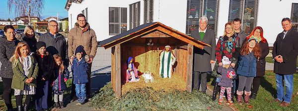 Gruppenfoto: v.l.n.r.: Carmen Kovacs, Yvonne Novak, Anton Konrad, Jerome Konrad mit den Kindern Emma, Xenia, Lia und Leo sowie rechts neben der Krippe Karl Knor, Bianca und Michael Aspan, Judith Knor, Bgm. Thomas Novoszel mit den Kindern Valentina und Isabella.