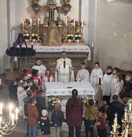6. decembra su se dica čuvarice i osnovne škole u Vulkaprodrštofu u farskoj crikvi skupaspravila da čekaju sv. Mikulu. Počela se je sveta bobožnost s adventskom jačkom. U svojoj kratkoj prodiki za dicu je farnik Štefan Jahns iz života sv. Mikule i za njegove dobre čine povidao. Po jačenju i skupnoj molitvi su se dica veselila kad je zaistinu došao sv. Mikula u crikvu i je imao sa svako dite jednu veliku mikulu iz čokolade.