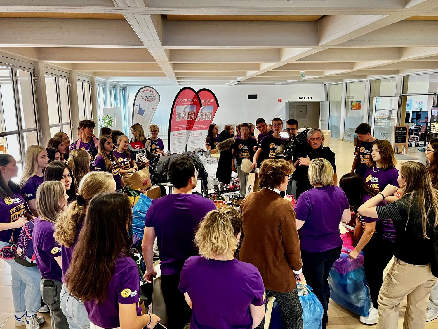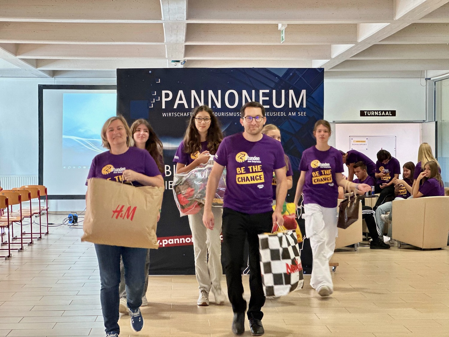 18 Schülerinnen und Schüler der 1CW der HLW Neusiedl am See sammelten unter der Regie von Gruppenleiterin Claudia Peter und Projektbetreuer André Thaler gebrauchte und neuwertige Schultaschen und Schulrücksäcken für Kinder, die sich keine eigenen leisten können.