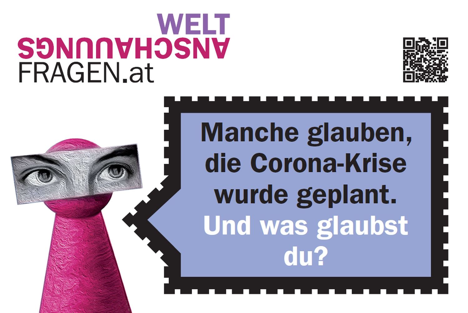 „Manche glauben, die Corona-Krise wurde geplant. Und was glaubst Du?“ Als Gegenüberstellung von aktuellen weltanschaulichen Positionen auf der einen und der Frage nach der je eigenen Überzeugung des/der Betrachter*in auf der anderen Seite, regt die Arbeitsgemeinschaft der katholischen Weltanschauungsreferent*innen Österreichs durch eine österreichweite Initiative zum Nachdenken an.
