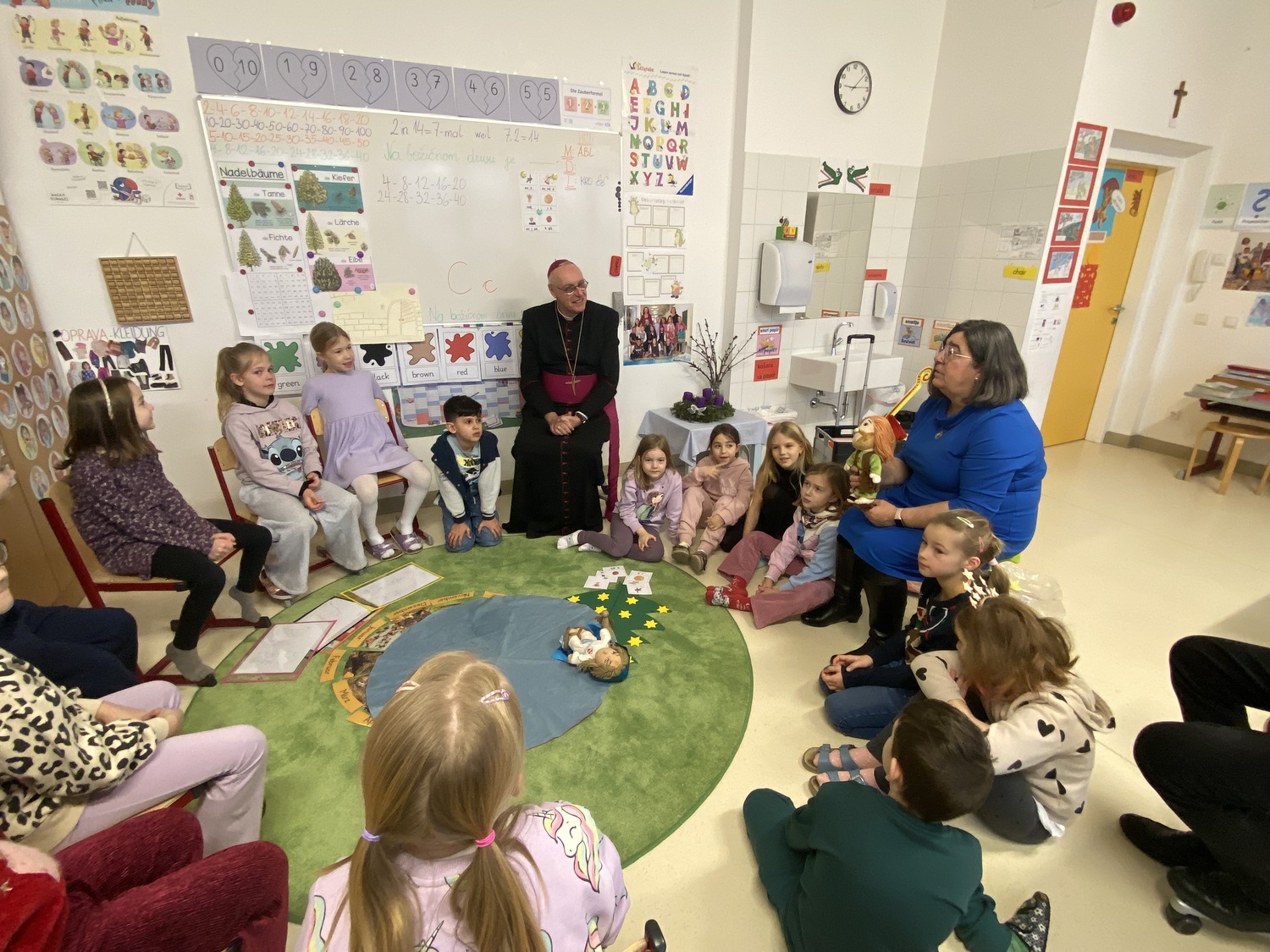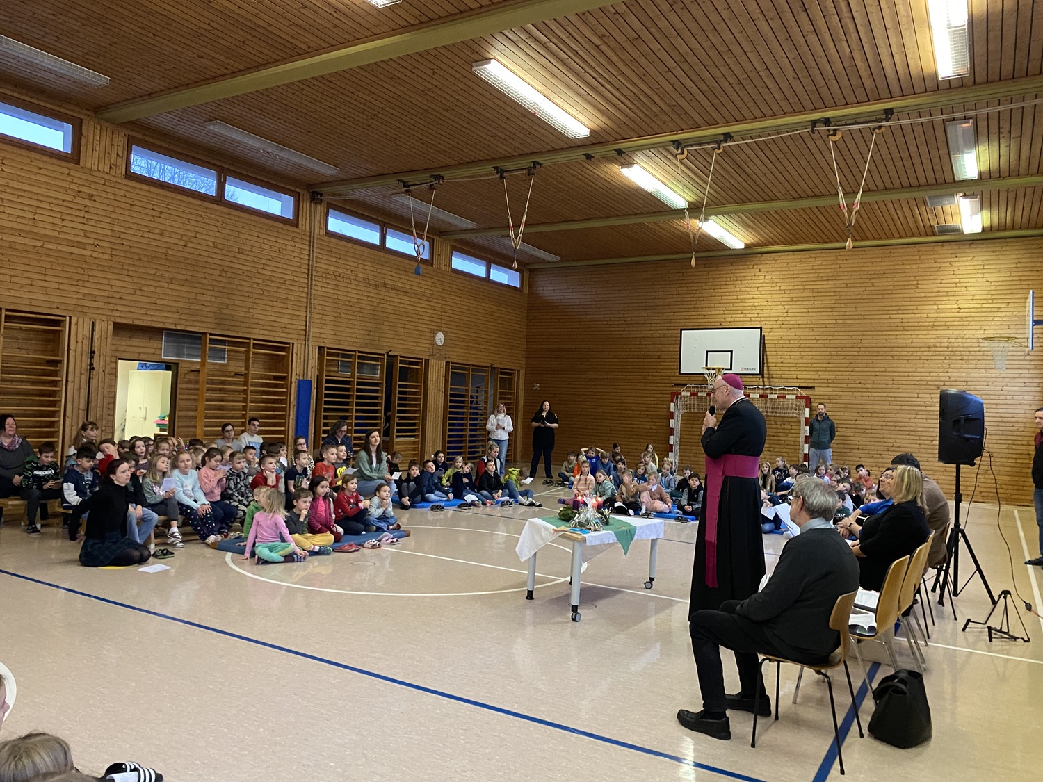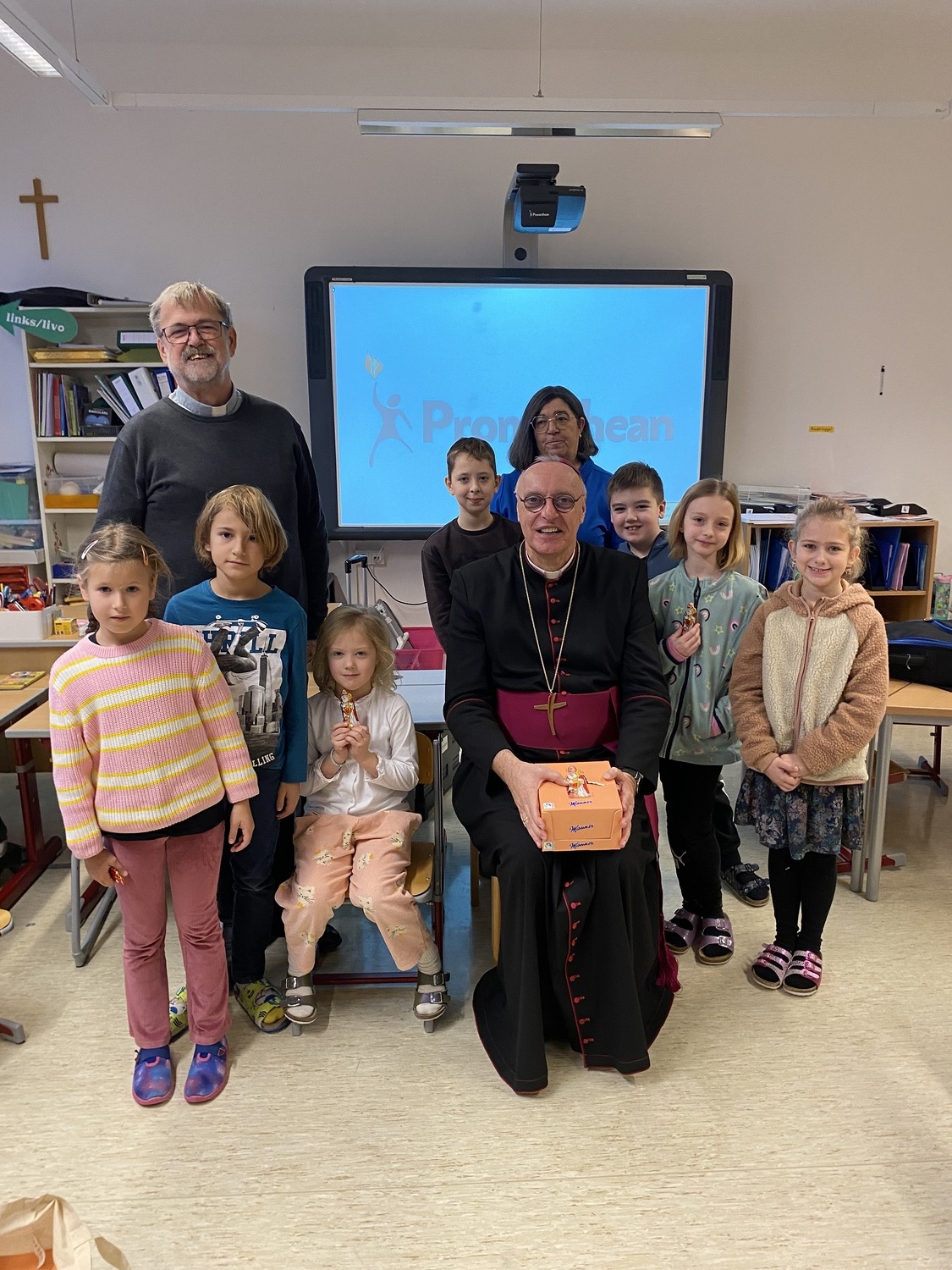 Nach einer stimmungsvollen gemeinsamen Adventandacht im Turnsaal, die von Religionslehrerin Maria Wiesinger zum Thema „Licht im Advent“ gestaltet wurde, nahm sich der Herr Bischof Zeit für den Besuch von drei Klassen. Die mitgebrachte Mitra und der besondere Bischofsstab des Herrn Diözesanbischofs weckten großes Interesse bei den neugierigen Schüler:innen. Besonders beeindruckt zeigte sich der Herr Bischof von einer Mehrstufenklasse, in der Schülerinnen und Schüler aller vier Schulstufen engagiert Fragen stellten und miteinander ins Gespräch kamen. Ein kulinarisches Beisammensein mit dem Kollegium bot anschließend Gelegenheit zum persönlichen Austausch.
