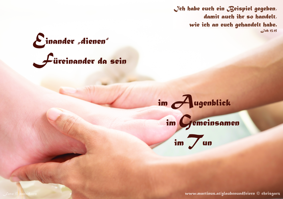 Als er ihnen die Füße gewaschen, sein Gewand wieder angelegt und Platz genommen hatte, sagte er zu ihnen: Begreift ihr, was ich an euch getan habe? Ihr sagt zu mir Meister und Herr und ihr nennt mich mit Recht so; denn ich bin es. Wenn nun ich, der Herr und Meister, euch die Füße gewaschen habe, dann müsst auch ihr einander die Füße waschen. Ich habe euch ein Beispiel gegeben, damit auch ihr so handelt, wie ich an euch gehandelt habe.