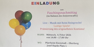 Auch heuer haben mit dem 1.Mittwoch im September die Pfarrcafé-Nachmittage wieder begonnen. Sie finden jeden1. und 3. Mittwoch im Monat von 14.00-17.00him Pfarrheim Eisenstadt/Oberberg statt....
