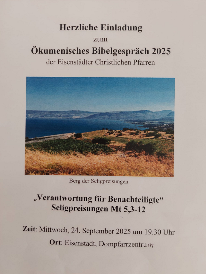Das Ökumenische Bibelgespräch 2025 fand heuer im Eisenstädter Dompfarrzentrum statt. Gebete, Bibeltexte, Lieder und Gespräche standen unter dem Thema: „Die Seligpreisungen – Verantwortung für Benachteiligte“. Vorbereitet wurde es vom Team aus den einzelnen Pfarren.