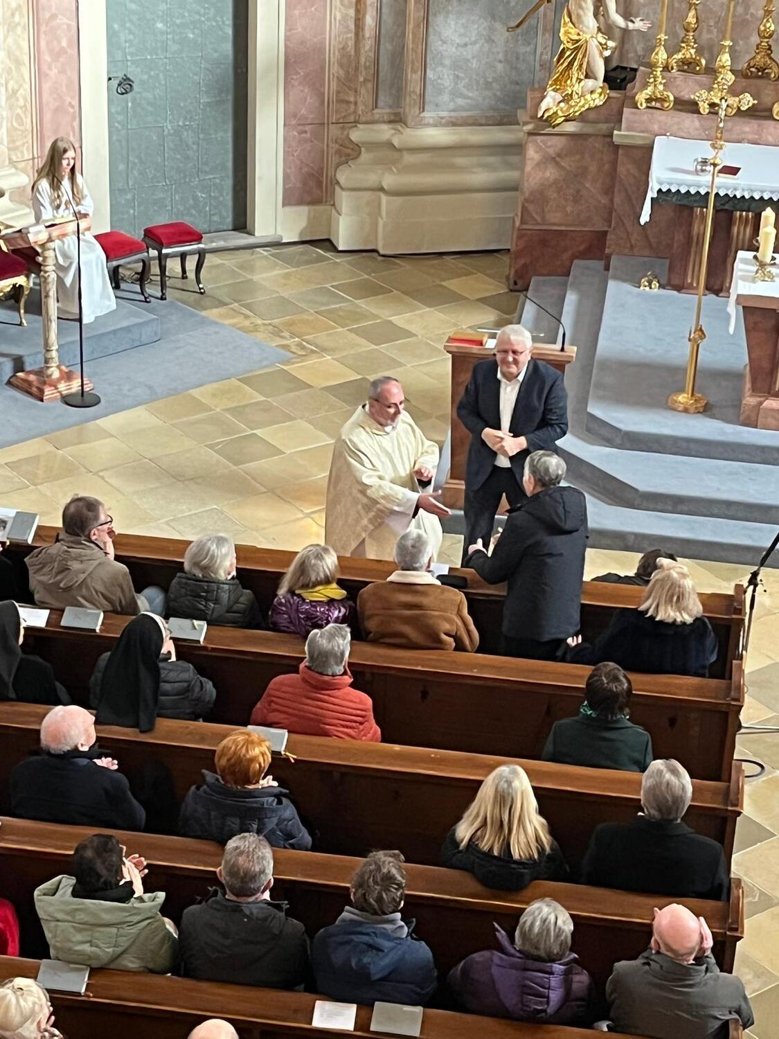 Neben dem Propstpfarrer P. Lorenz Voith, Bürgermeister Mag. Thomas Steiner sowie Linde Devos, Leiterin von Chor und Orchester der Haydnkirche, schlossen sich Viele den Gratulationen an.