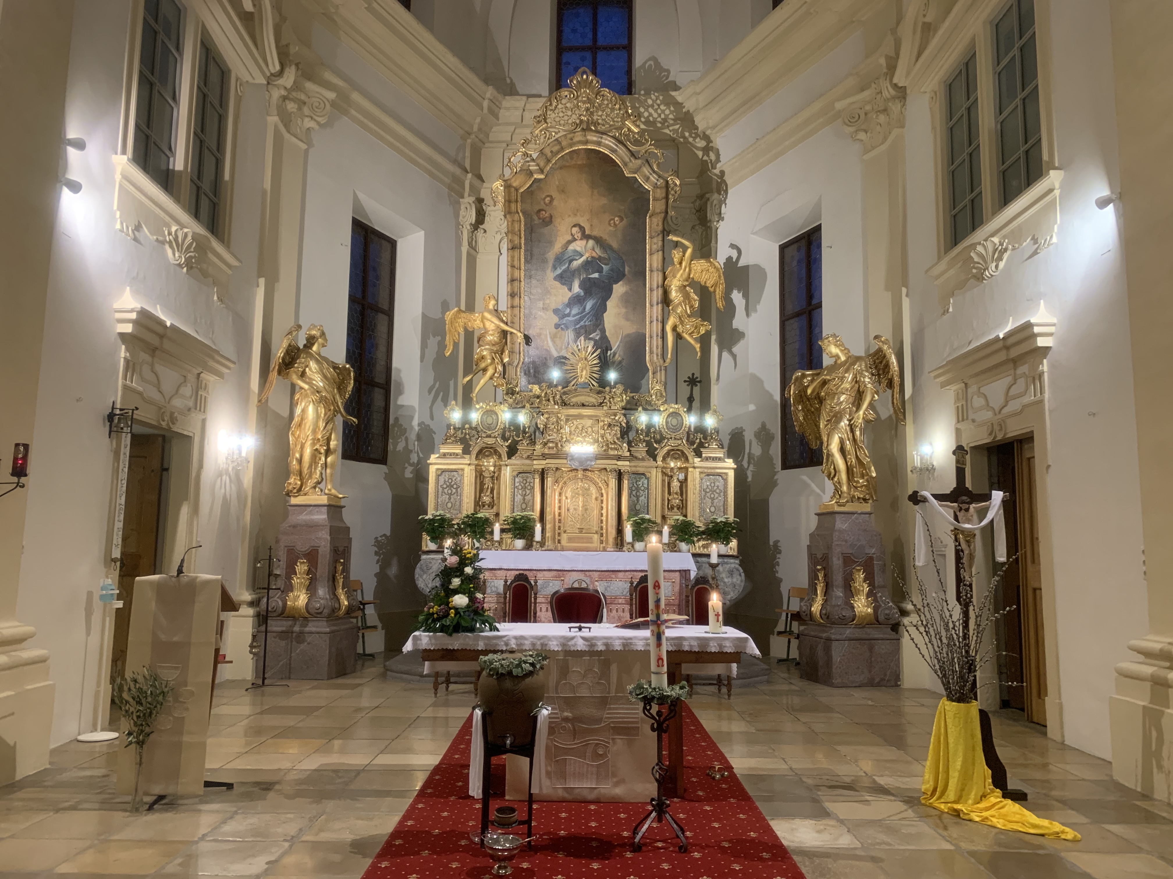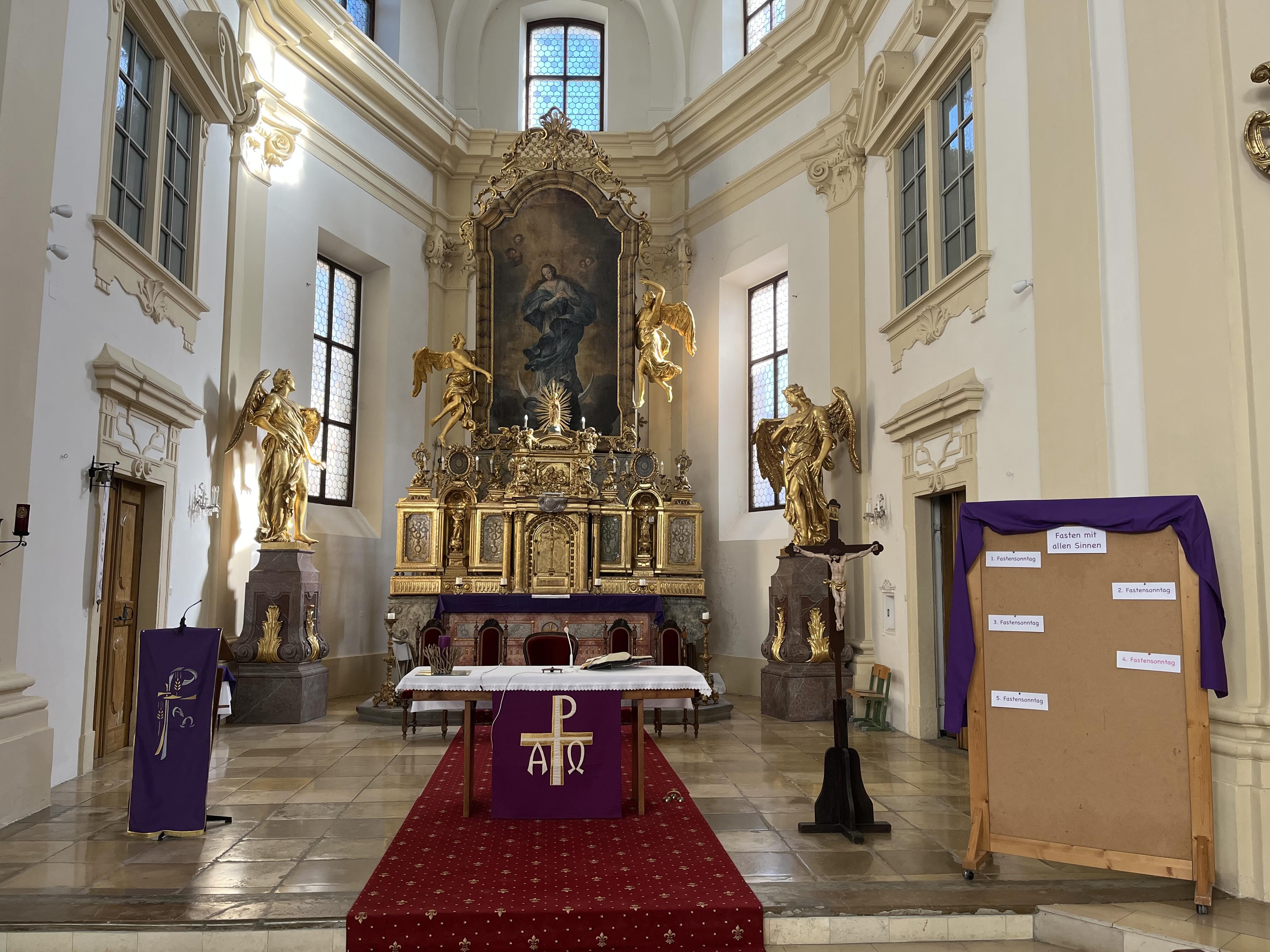 Das Riesenkreuz von Wimpassing war früher über dem Hochaltar und hatte eine Länge von 7 Metern und eine Breite von 4,60 Meter. Es war aus Lärchenholz gefertigt und von allen Seiten mit Pergament überzogen. Das 700kg schwere Kruzifix wurde so gebaut, dass man es nicht zerlegen konnte. Bei der Kirchräumung in der josephinischen Zeit gelangte es nach Wimpassing. Nach 154 Jahre wurde es dann 1938 zur Restaurierung nach Wien gebracht, wo es 1945 beim großen Brand des Stephansdoms ein Raub der Flammen wurde.