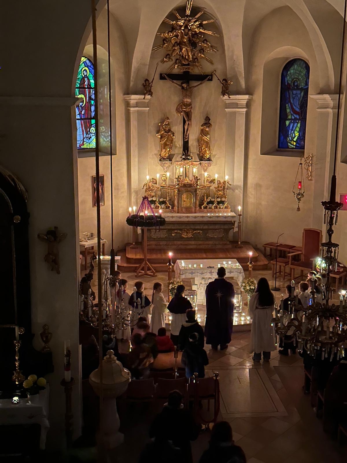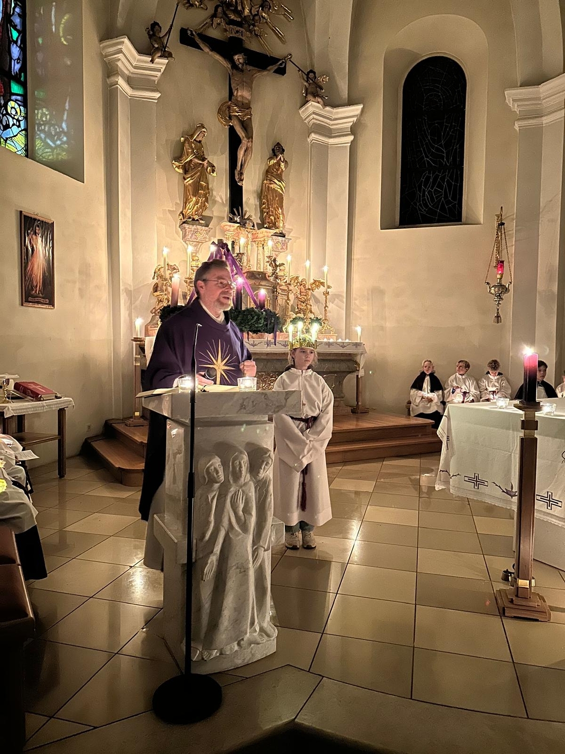 Im Gedenken an die hl. Lucia feierte Pfarrmoderator Mag. Stefan Jahns die Roratemesse am Montag, 15.12.2025. Zur Mitfeier waren besonders Schüler und Jugendliche eingeladen. Viele mitgebrachte Kerzen erleuchteten die Kirche und so wurde die Messe ohne elektrische Beleuchtung gefeiert.