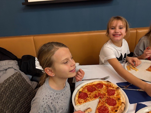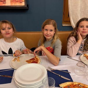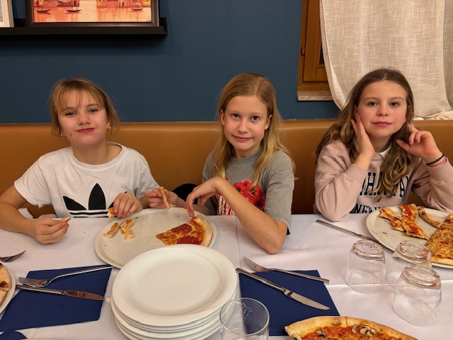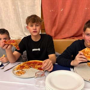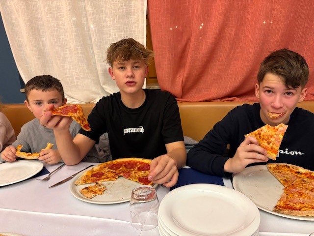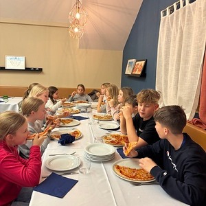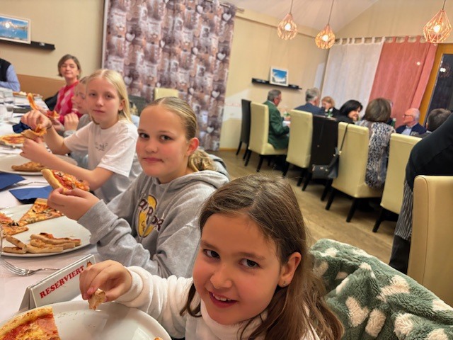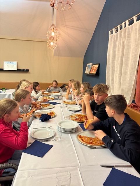Nach der sportlichen Betätigung ging es zur Stärkung in die Pizzeria La Rosa Blu, wo wir gemeinsam mit Herrn Pfarrer ein gemütliches Pizzaessen genießen durften. In entspannter Atmosphäre war Zeit für Gespräche, Gemeinschaft und viele fröhliche Momente.