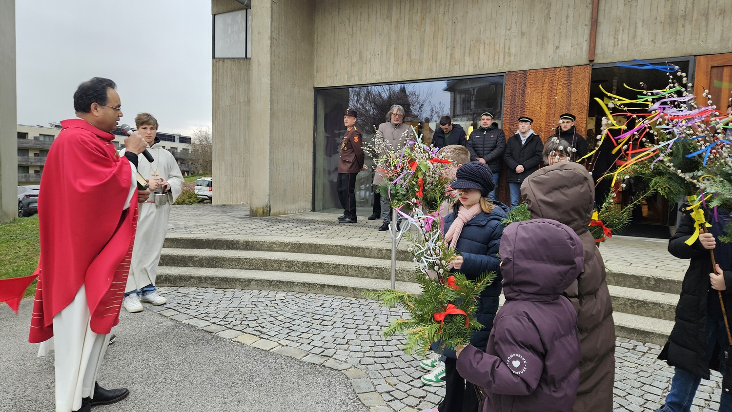 Den Einzug Jesu in Jerusalem feierte die Pfarre Bad Sauerbrunn am Sonntag, dem 29. März 2026 0830 Uhr mit Palmbuschen und Palmzweigen. Auf Grund der eher herausfordernden Wetterbedingungen, wurde die Palmprozession abgesagt. Auch die Leidensgeschichte unseres Herrn Jesus Christus wurde vorgetragen.