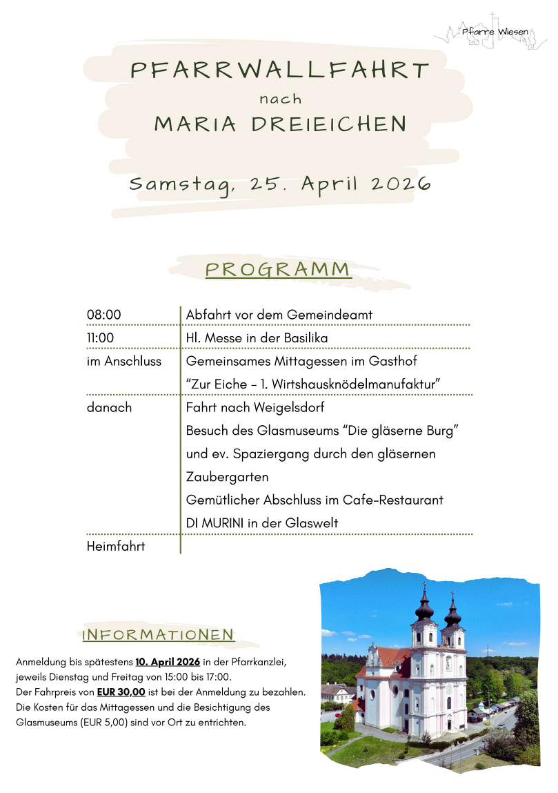 Wir bitten um Kenntnisnahme, dass der Pfarrbrief immer am Freitag vor dem letzten Sonntag im Monat gedruckt wird. Messintentionen die im Pfarrbrief gedruckt werden sollen, können in der Pfarrkanzlei nur bis zu diesem Zeitpunkt angenommen werden.