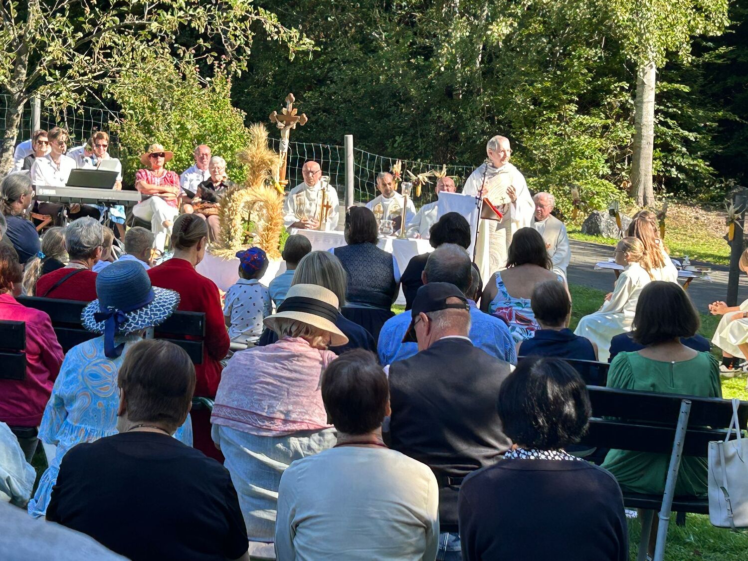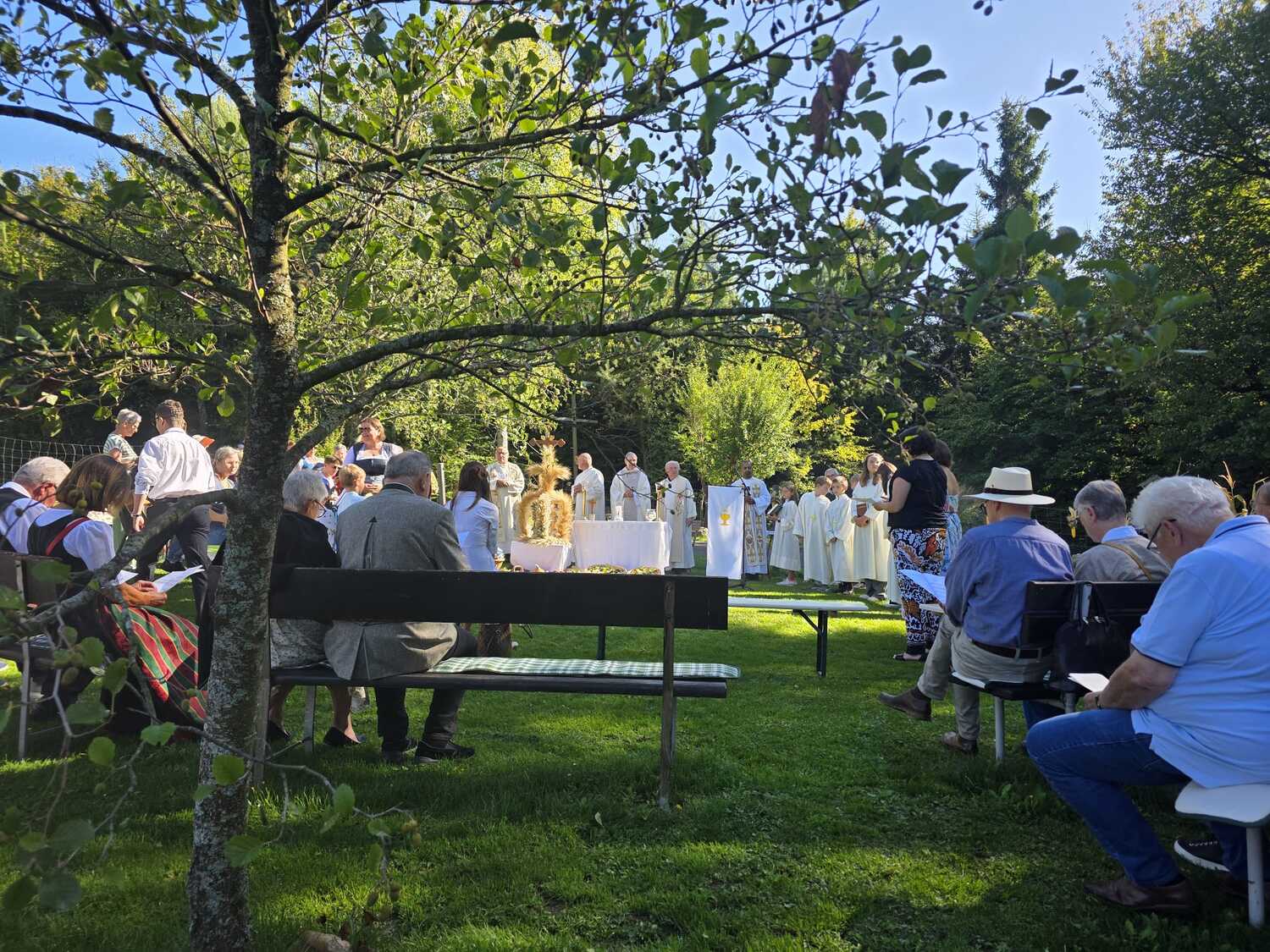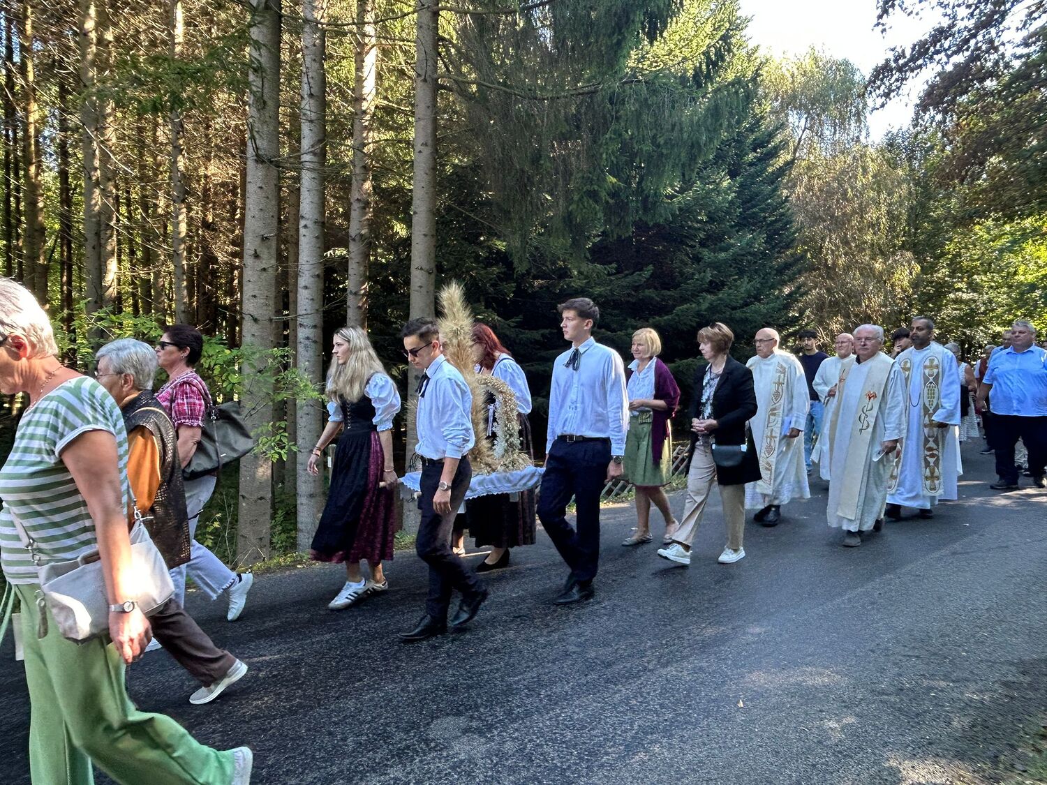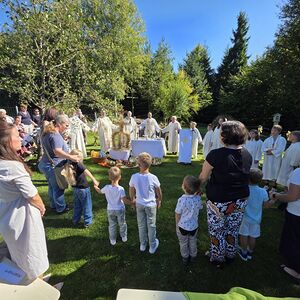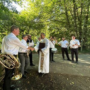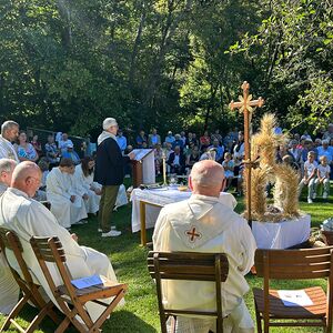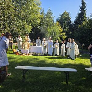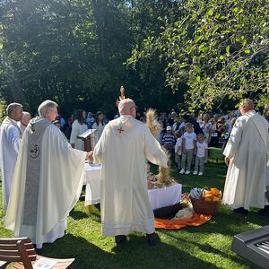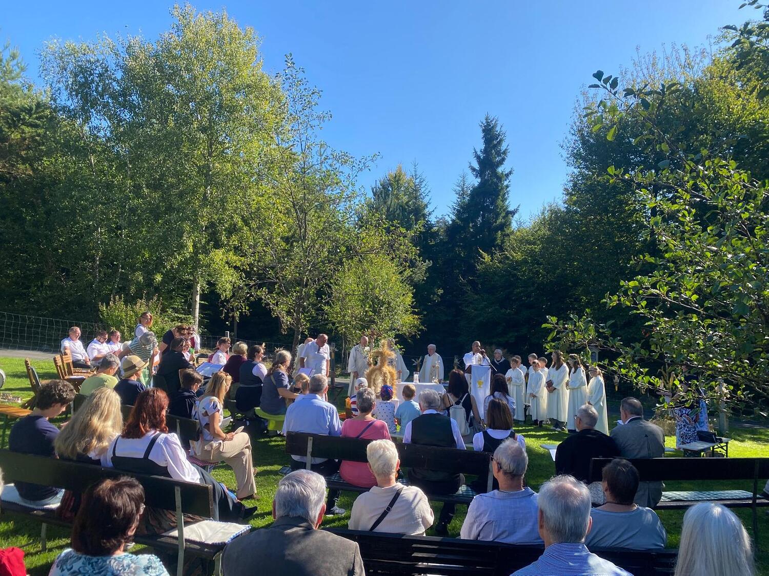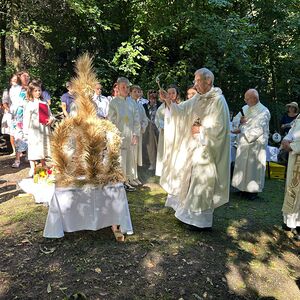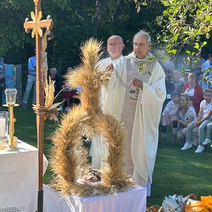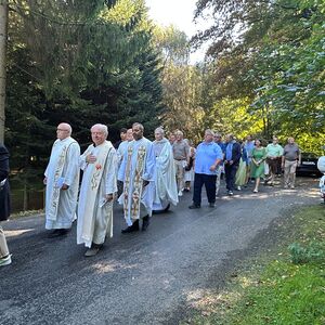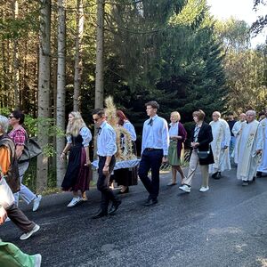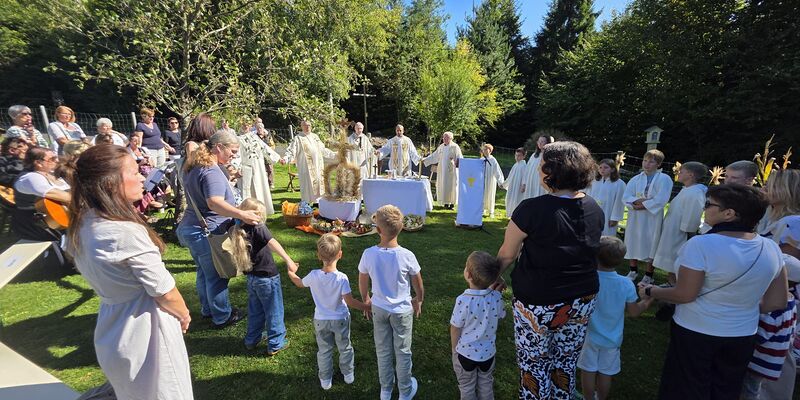 Dieses besondere Jubiläum feierten wir heuer im Rahmen des Erntedankfestes – selbstverständlich direkt am Kreuzweg. Der feierliche Festzug wurde von der Musikkapelle Kobersdorf musikalisch würdevoll angeführt. Der gemeinsame Weg begann bei der 13. Station und führte uns entlang des Weges bis zur 15. Station, wo die Heilige Messe unter freiem Himmel gefeiert wurde.