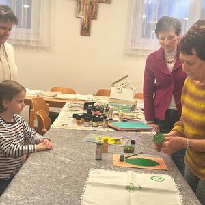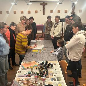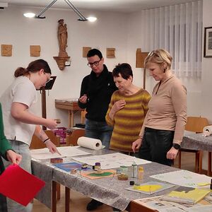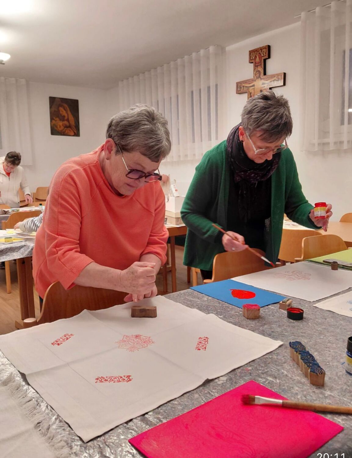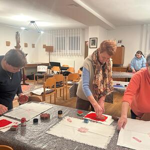 Am vergangenen Donnerstag, dem 26. März, verwandelte sich unser Pfarrheim in eine kreative Werkstatt. Unter der fachkundigen und inspirierenden Leitung von Frau Christa Fraunschiel - einer vielseitig engagierten Dame aus unserer Filiale Kalkgruben - tauchten zahlreiche Teilnehmerinnen in die faszinierende Welt des Stoff-Handdrucks ein.
