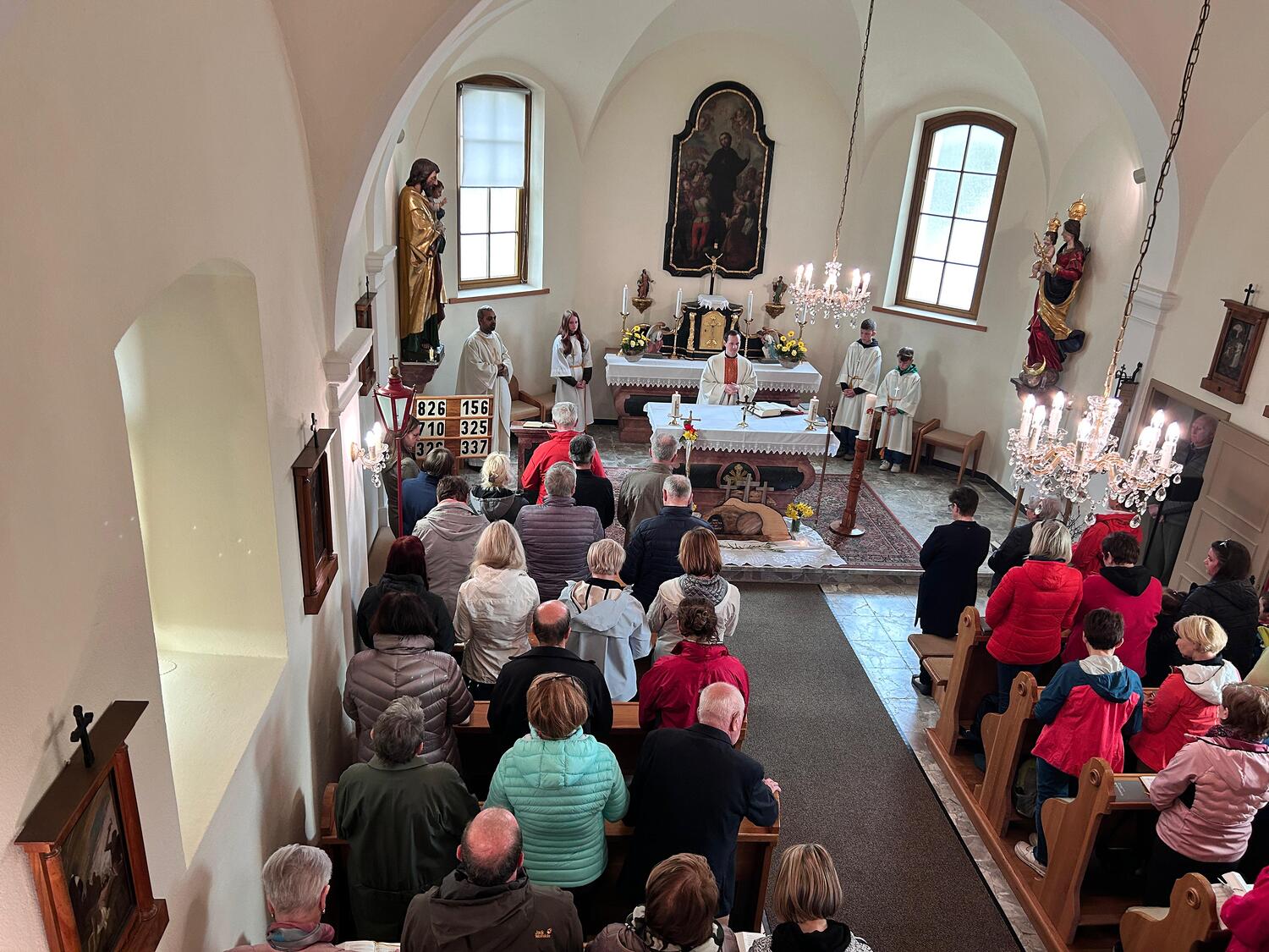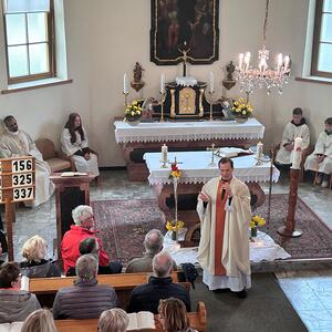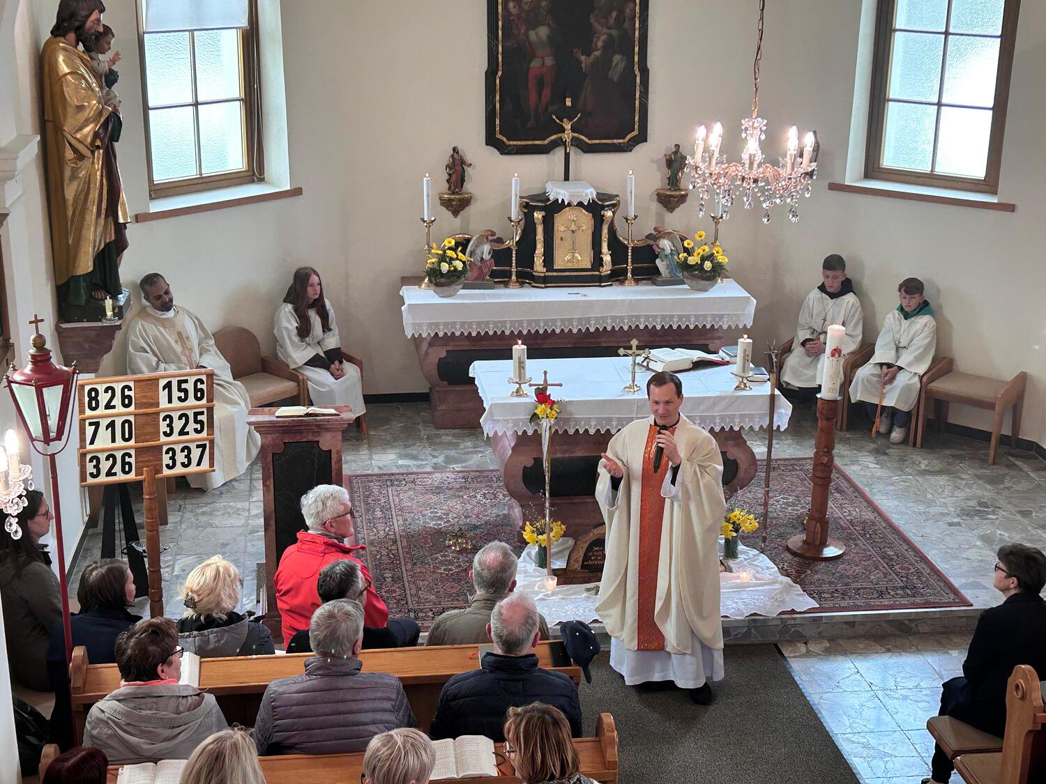 Gut gestärkt versammelte sich die Gemeinschaft anschließend in der Filialkirche zur feierlichen Heiligen Messe mit Pater David Gold. In seiner Predigt schlug er die Brücke vom Evangelium zu unserem heutigen Alltag: Auch wir dürfen darauf vertrauen, dass der Auferstandene uns auf unseren persönlichen Lebenswegen begleitet – oft unerkannt, aber immer gegenwärtig.