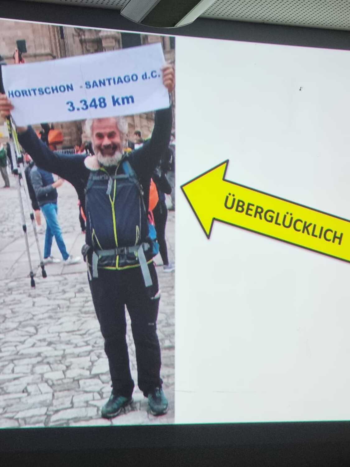 Unter dem Titel „Mein Jakobsweg“ erzählte er von seiner Wanderung, die am 6. Mai mit dem Pilgersegen in Horitschon begann und ihn nach 3.348 Kilometern bis nach Santiago de Compostela führte.