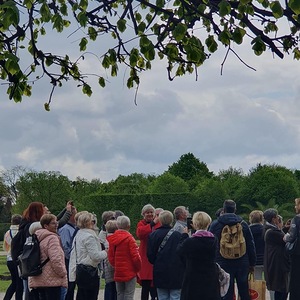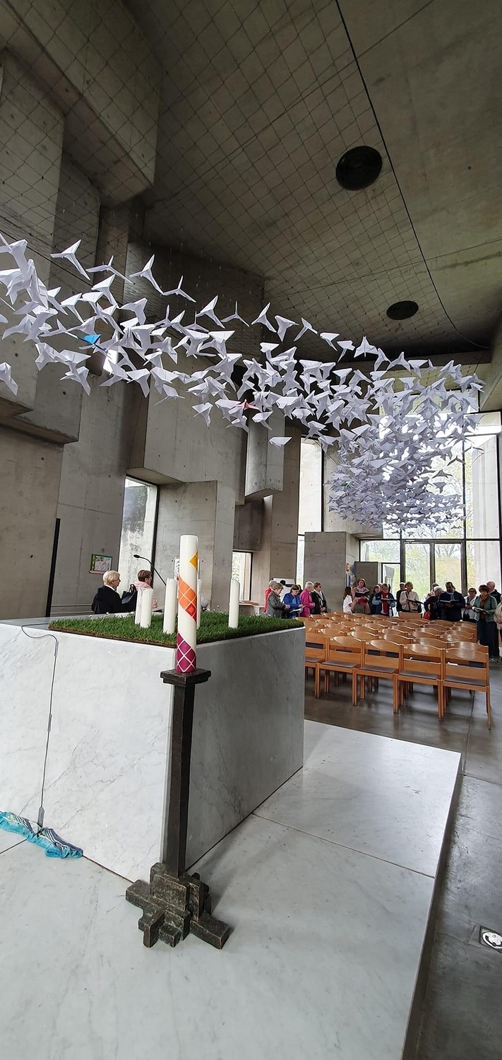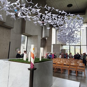Beendet wurde der Ausflug mit einem Besuch der Wotrubakirche am Georgenberg in Wien-Mauer, welche in den 70-ger Jahren des 20. Jahrhunderts nach Entwürfen des Bildhauers Fritz Wotruba erbaut wurde. Das Kirchengebäude ist stilistisch dem Brutalismus zuzurechnen. Die Wotrubakirche, die heute zu den touristischen Sehenswürdigkeiten von Wien zählt, wirkte auf die knapp 60 Reiseteilnehmer sehr beeindruckend.