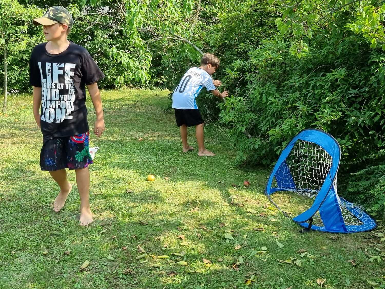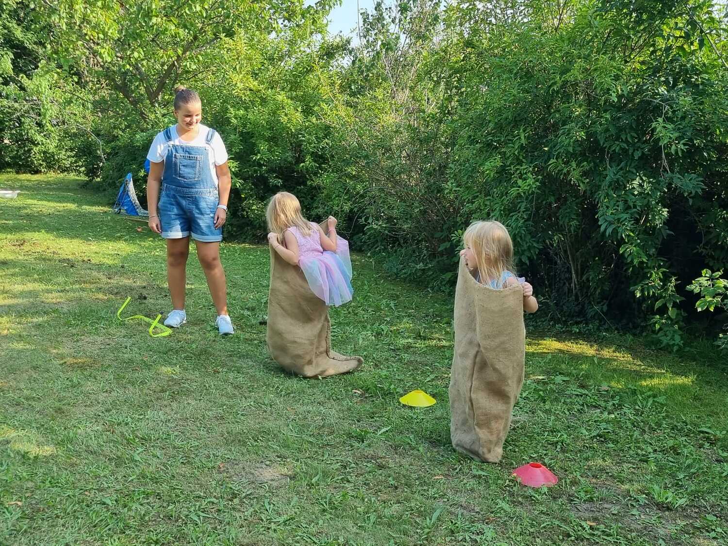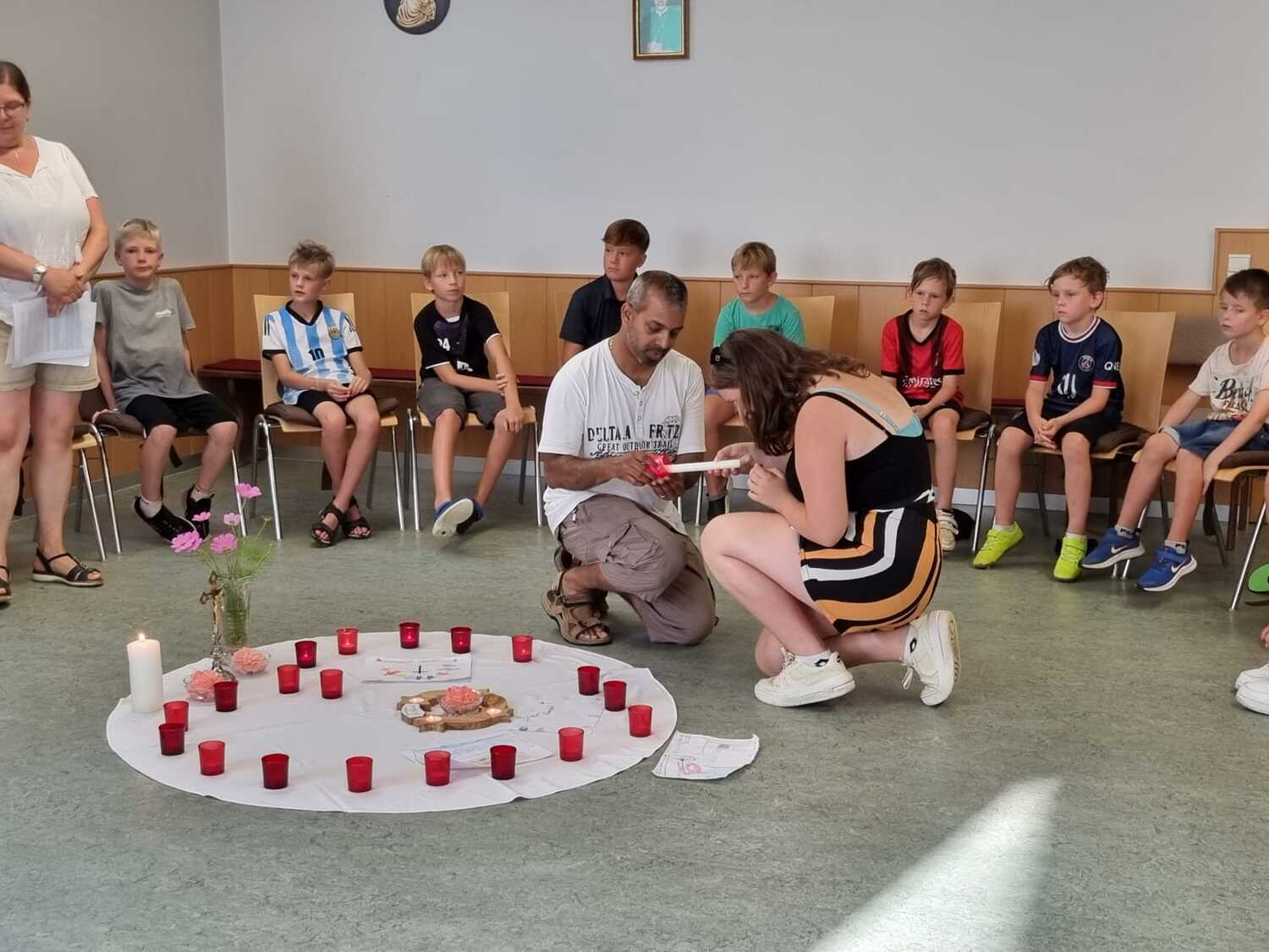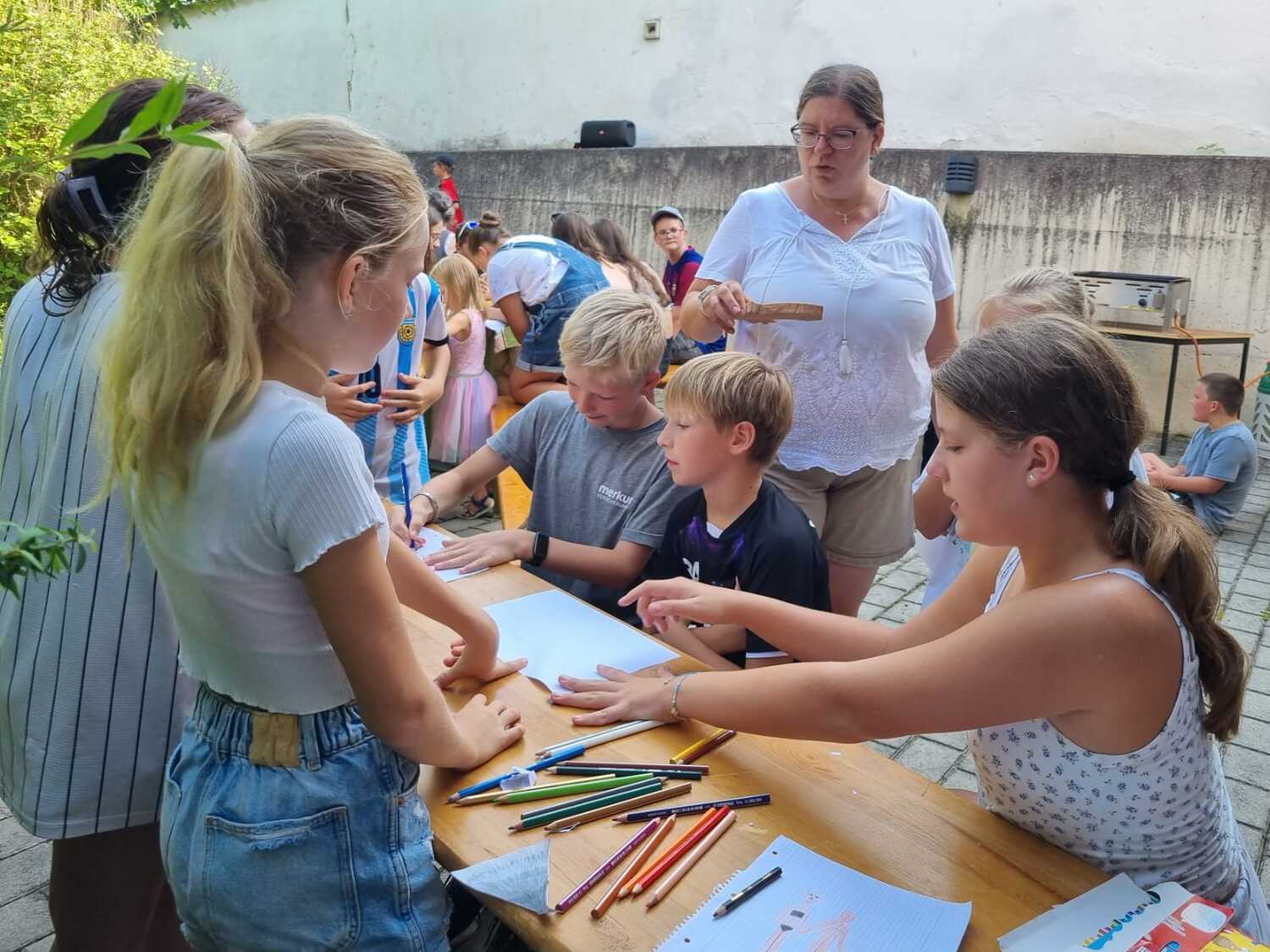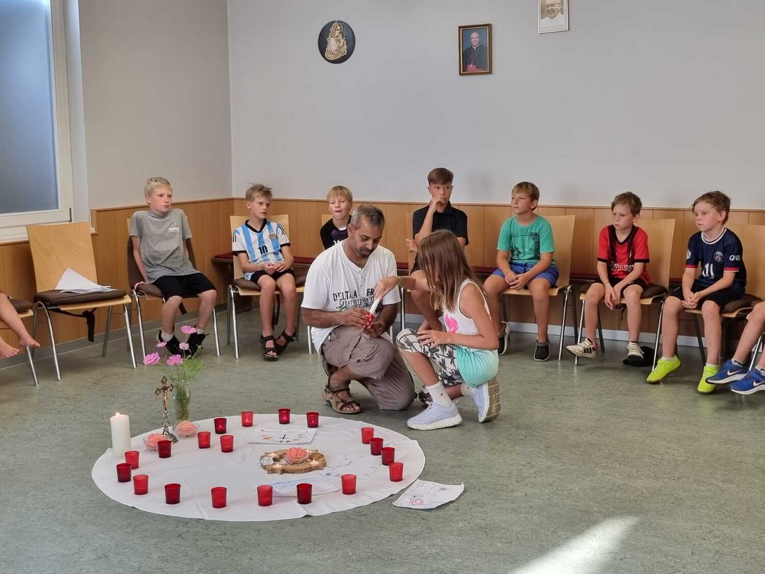 Um 15 Uhr versammelten sich alle im Pfarrhof Lackenbach. Nach einer Begrüßungsrunde spielten wir im schattigen Garten. Wir hatten für die Kinder verschiedene Spiele aufgebaut z.B: Sackhüpfen, Dosen werfen, Fußball, Boccia, Federball, Ball über die Schnur, Uno…. . Doch besonders Spaß machte unsere Wasserbombenschlacht, wo niemand trocken blieb –sogar Herrn Pfarrer Shinto haben wir erwischt. J