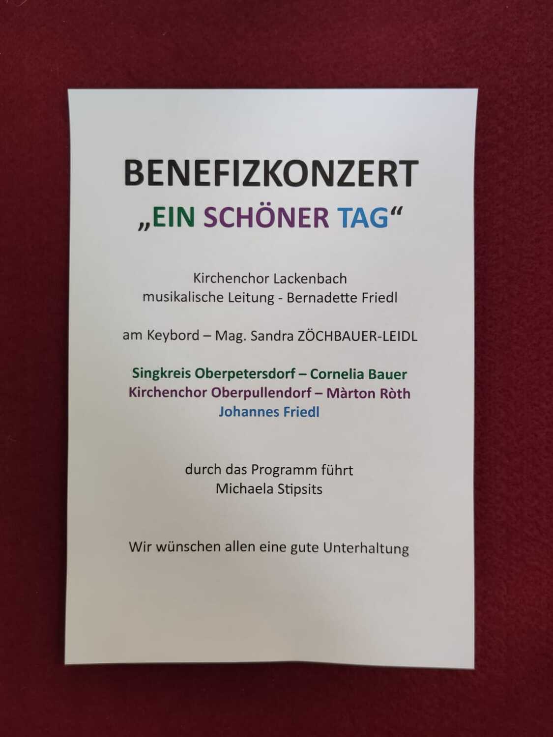 Der Kirchenchor Lackenbach veranstaltete am 24.9.2023 in der Pfarrkirche ein Benefizkonzert unter dem Motto „Ein schöner Tag“, geleitet von Bernadette Friedl.