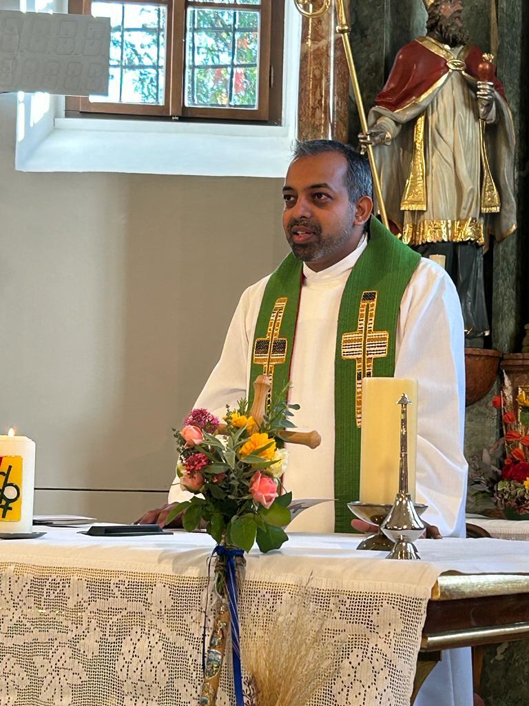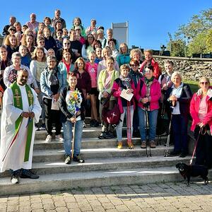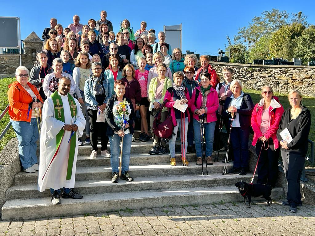 Mit diesem Gebet, mit dem gesegneten Pilgerstab und den Segen Gottes, erteilt von Pf. Shinto, machten sich 53 Frauen und 4 Männer auf den Weg um ca. 10 km bei strahlendem Sonnenschein, am Fuße der Landseer Berge zu pilgern.