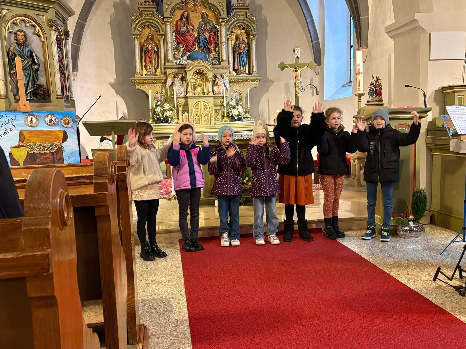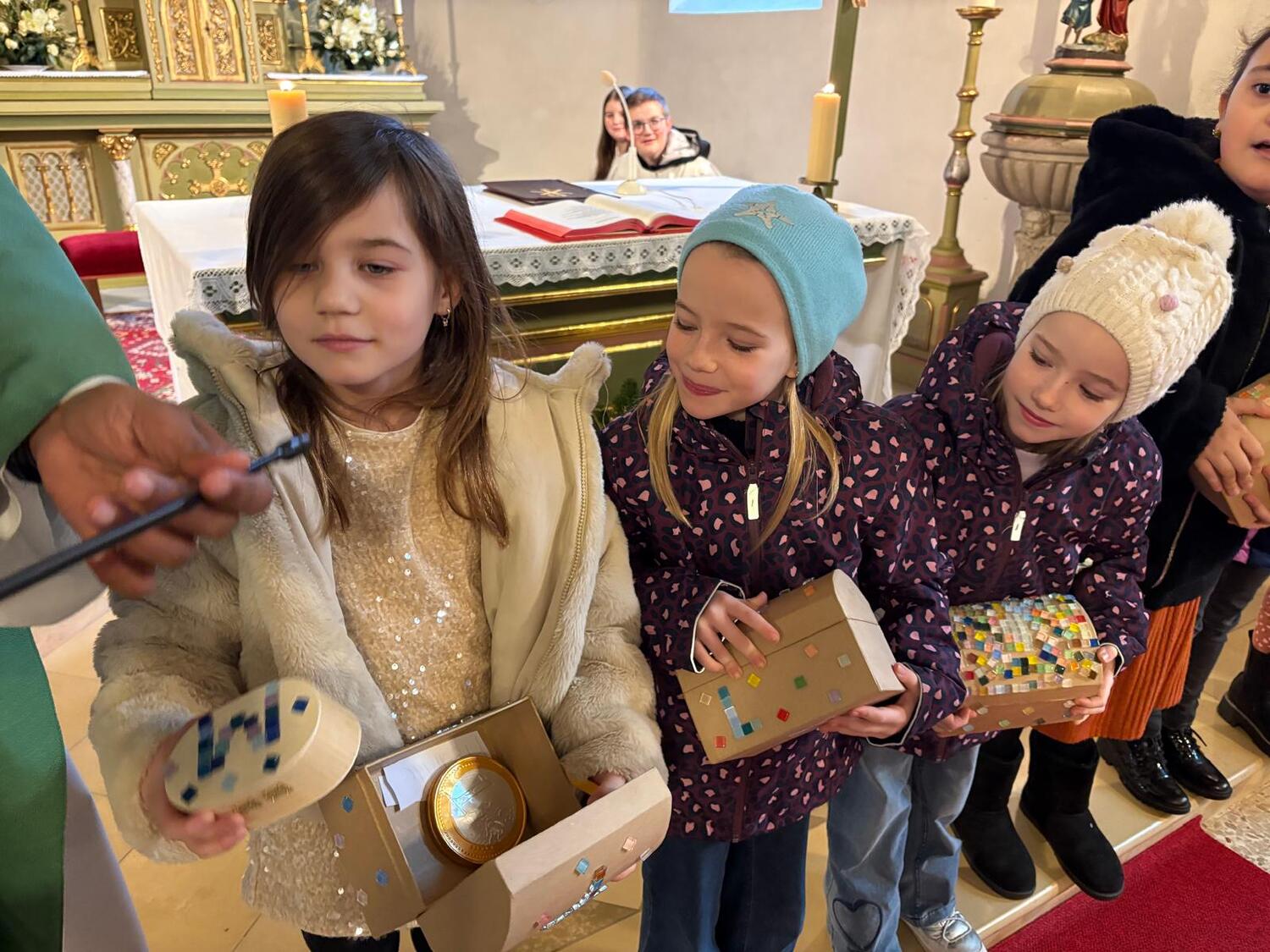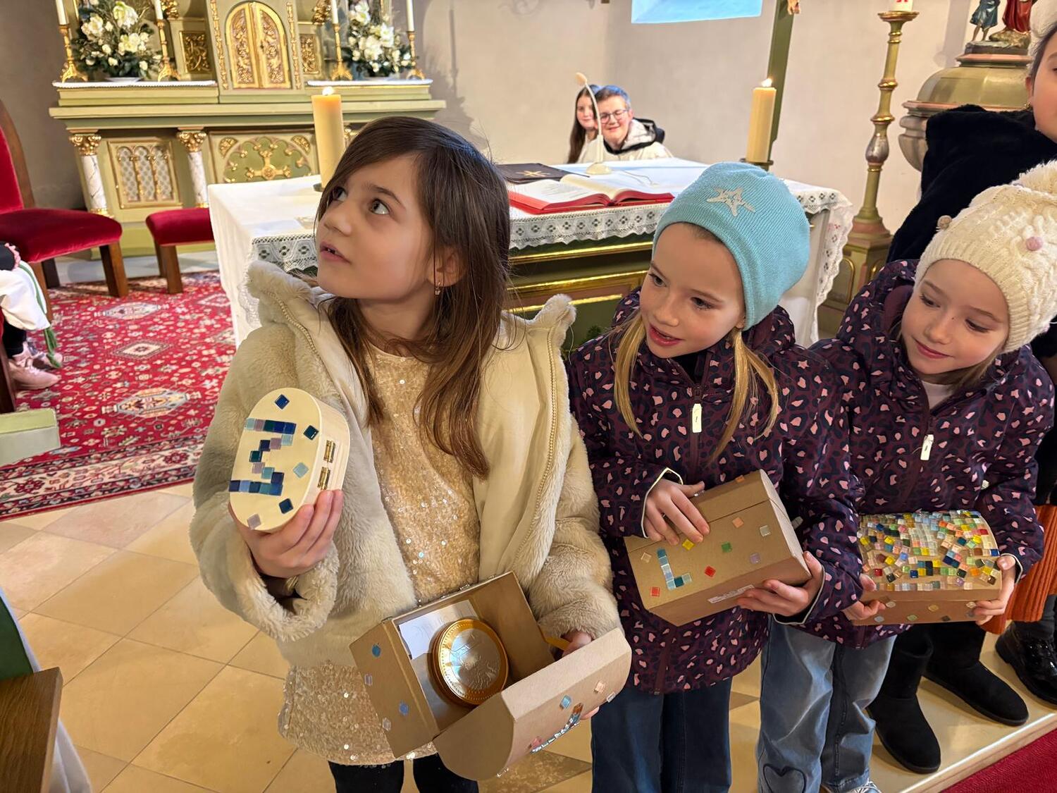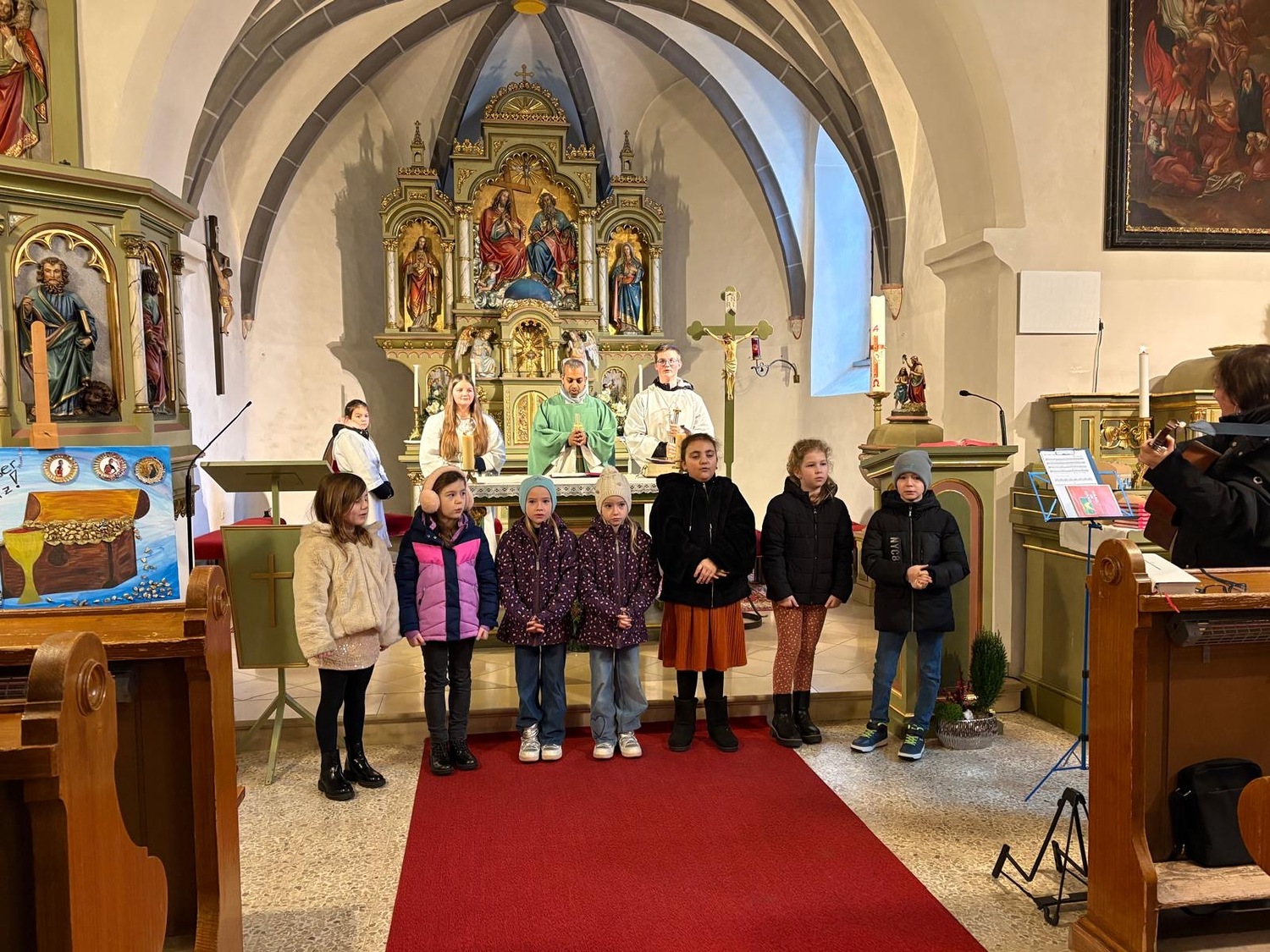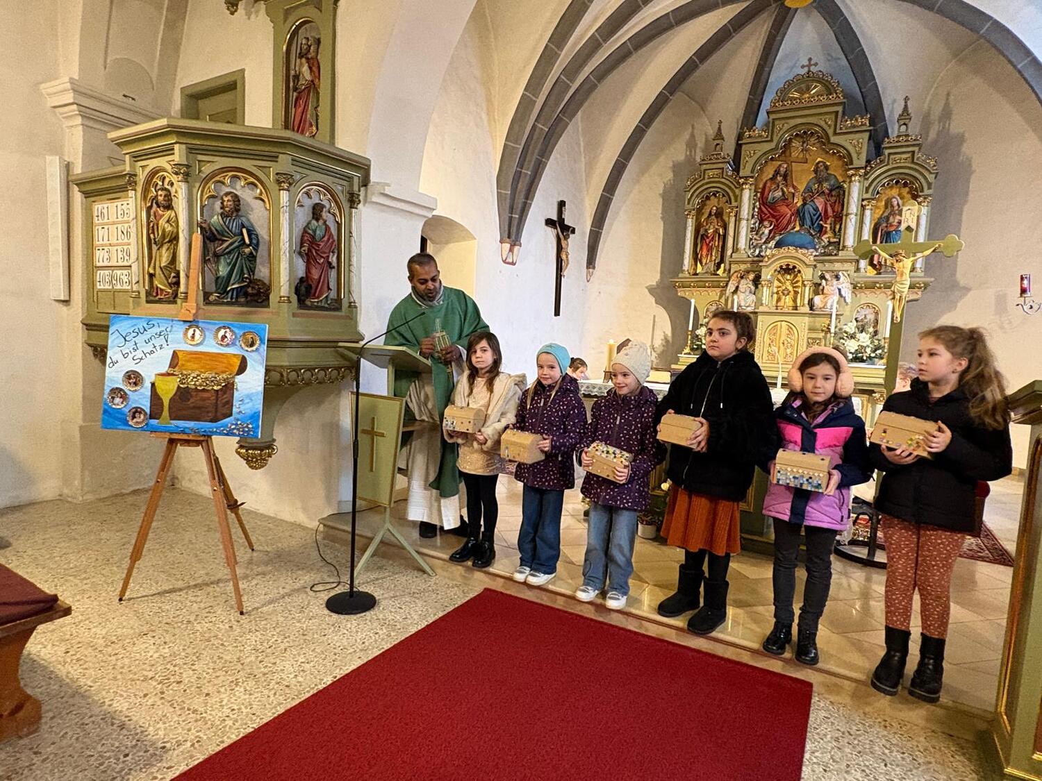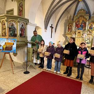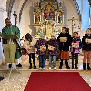 Im Rahmen des Sonntagsgottesdienstes wurden die Erstkommunionkinder unserer Pfarre feierlich mit einer eigenen Kinderbibel beschenkt. Passend zum Erstkommunionthema „Jesus, du bist mein Schatz“ gestalteten die Kinder gemeinsam mit ihrer Religionslehrerin Frau Doris Horvath den Gottesdienst musikalisch mit und brachten ihre liebevoll selbstgebastelten Schatztruhen mit in die Kirche.