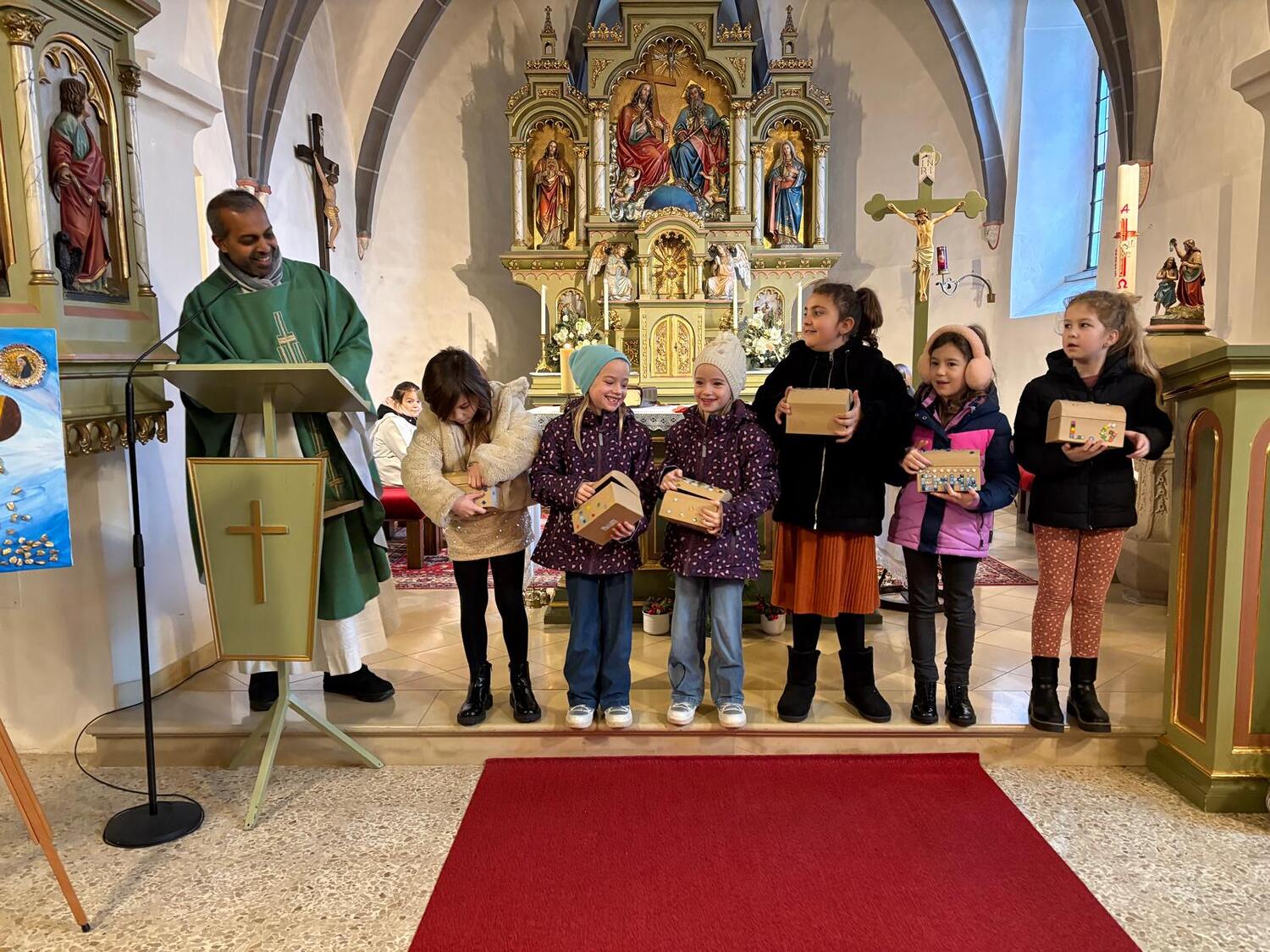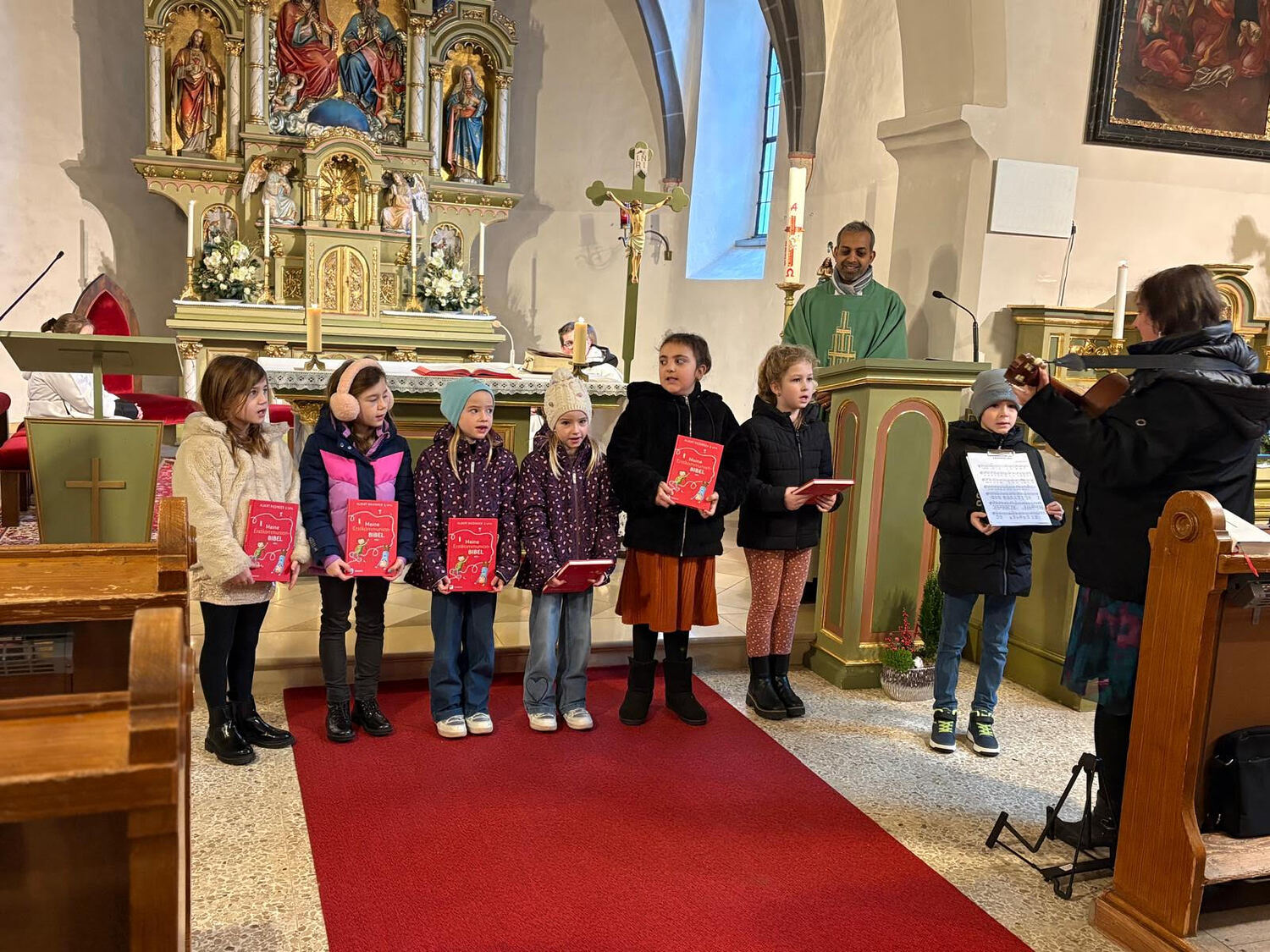 Ein besonderer Moment war die Übergabe der Bibeln durch Pfarrer Shinto. Er erklärte den Kindern die Bedeutung dieses besonderen Buches, das sie auf ihrem Weg zur Erstkommunion – und weit darüber hinaus – begleiten soll und machte den Kindern Mut, die Bibel als einen echten Schatz zu entdecken: als ein Buch, das von Gottes Liebe erzählt, Orientierung für das Leben gibt und von Jesus berichtet, der als guter Hirte immer bei uns ist – in frohen wie in schweren Momenten.