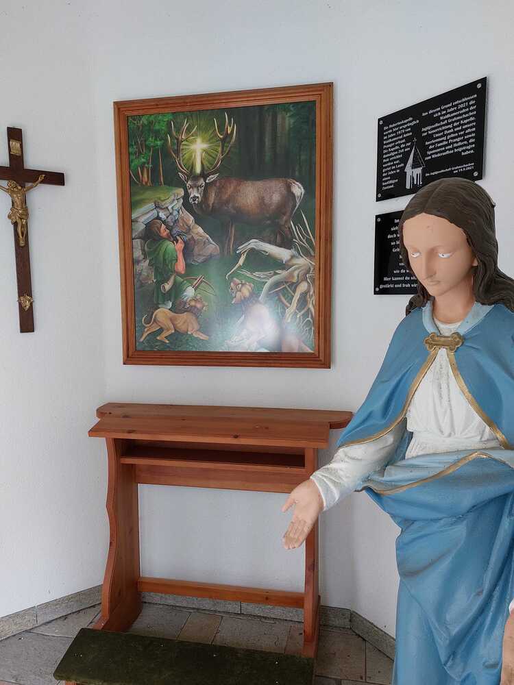 Quelle: Vgl. Wappel, Margit: Hubertuskapelle in Unterwaldbauern, in: Pfarrblatt Grafenschachen – Neustift/Lafnitz – Kroisegg, Sommer 2009, Jahrgang 8, Ausgabe 2, S.6.