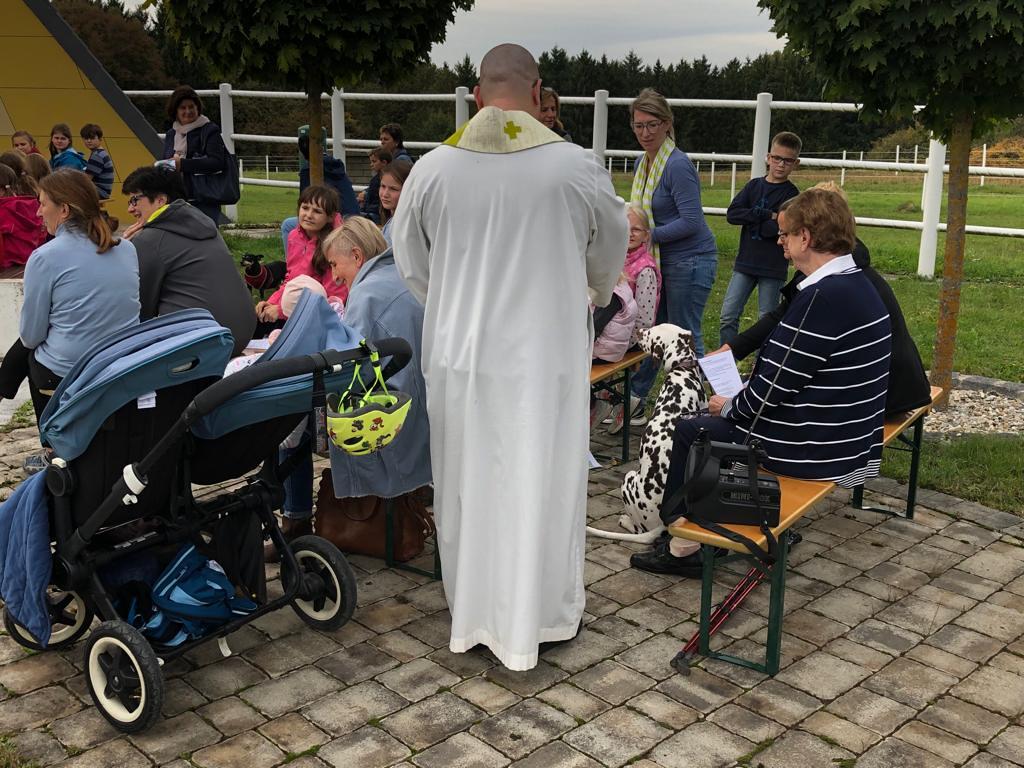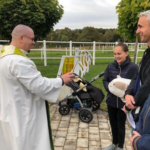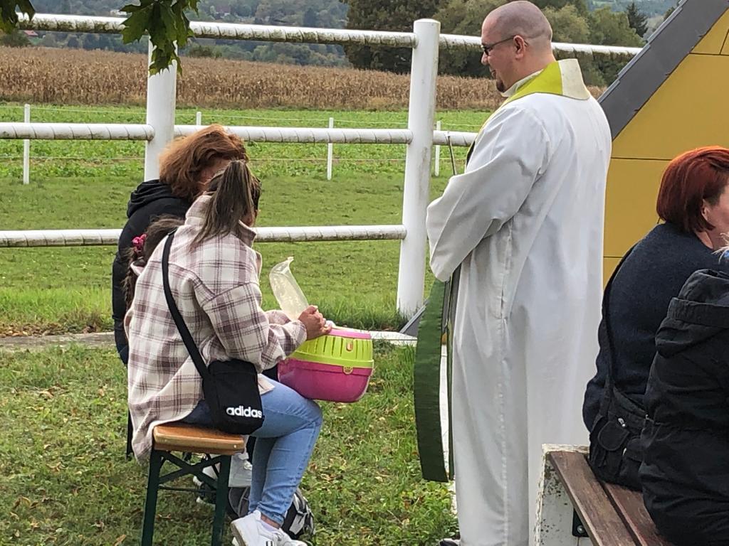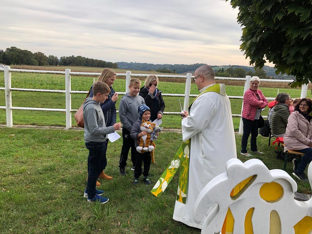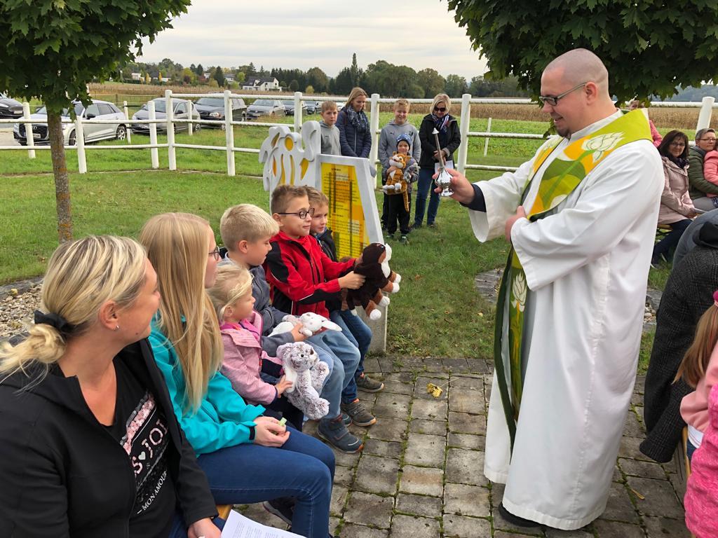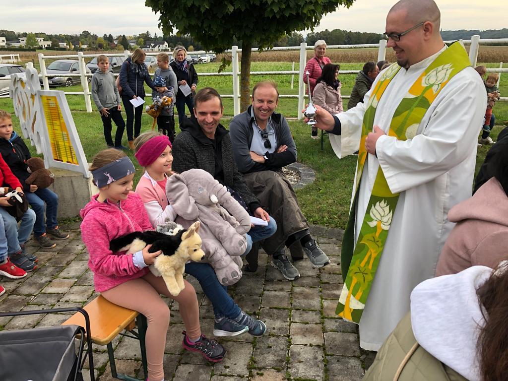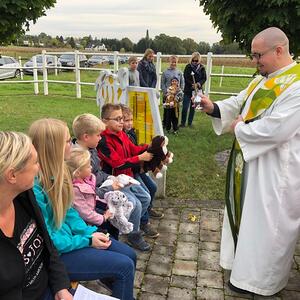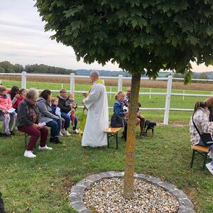 Hunde, Katzen, Hasen und weitere Tiere sowie alle Arten von Stofftieren fanden sich gemeinsam mit ihren Besitzern am 5. Oktober bei der Kreuzkapelle der Familie Jandrisic ein. Die Tiersegnung rund um den Gedenktag des Hl. Franz von Assisi und Welttierschutztag bei dieser besonderen Kapelle umgeben von einer Pferdekoppel hat schon Tradition. Wie in den Vorjahren kamen auch heuer wieder viele Zwei- und Vierbeiner, um sich den Segen von Pfarrer Thorsten Carich zu holen. Pastoralassistentin Sandra Krammer hatte die kindgerechte Gestaltung vorbereitet und die Gastgeberinnen Silvia und Sonja Jandrisic luden anschließend zu einer kleinen Stärkung ein. Vergelt's Gott!