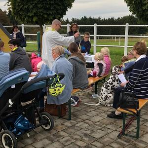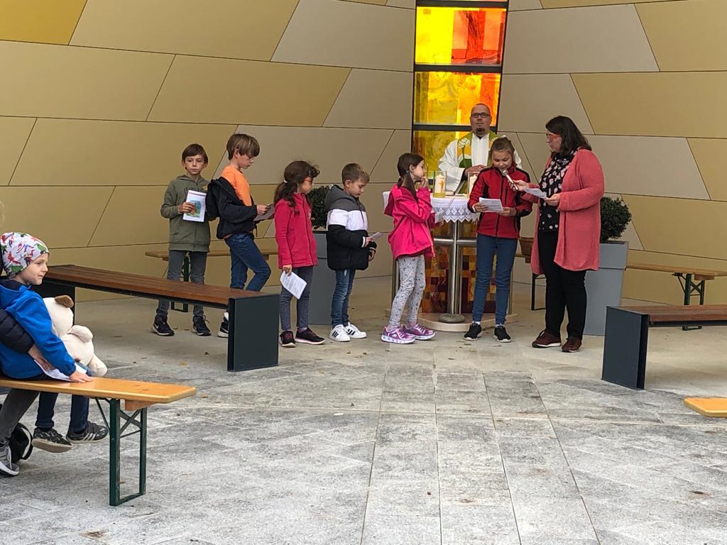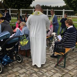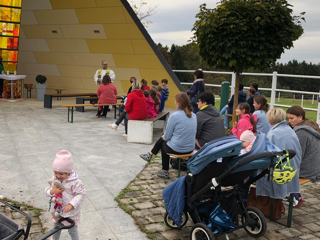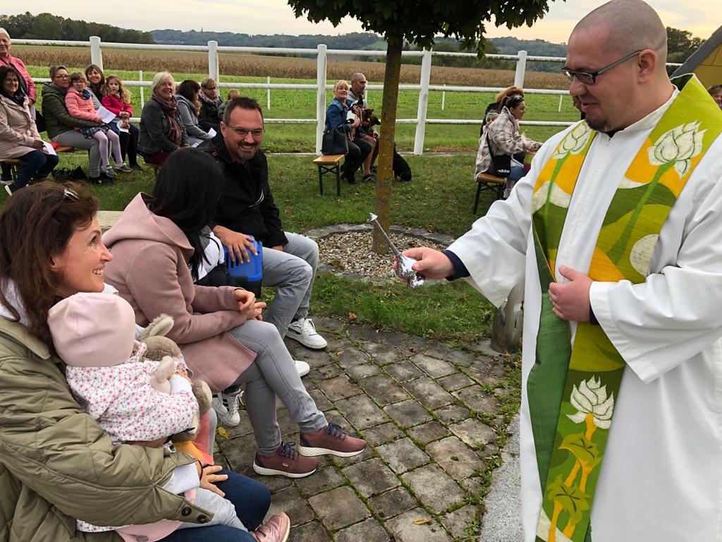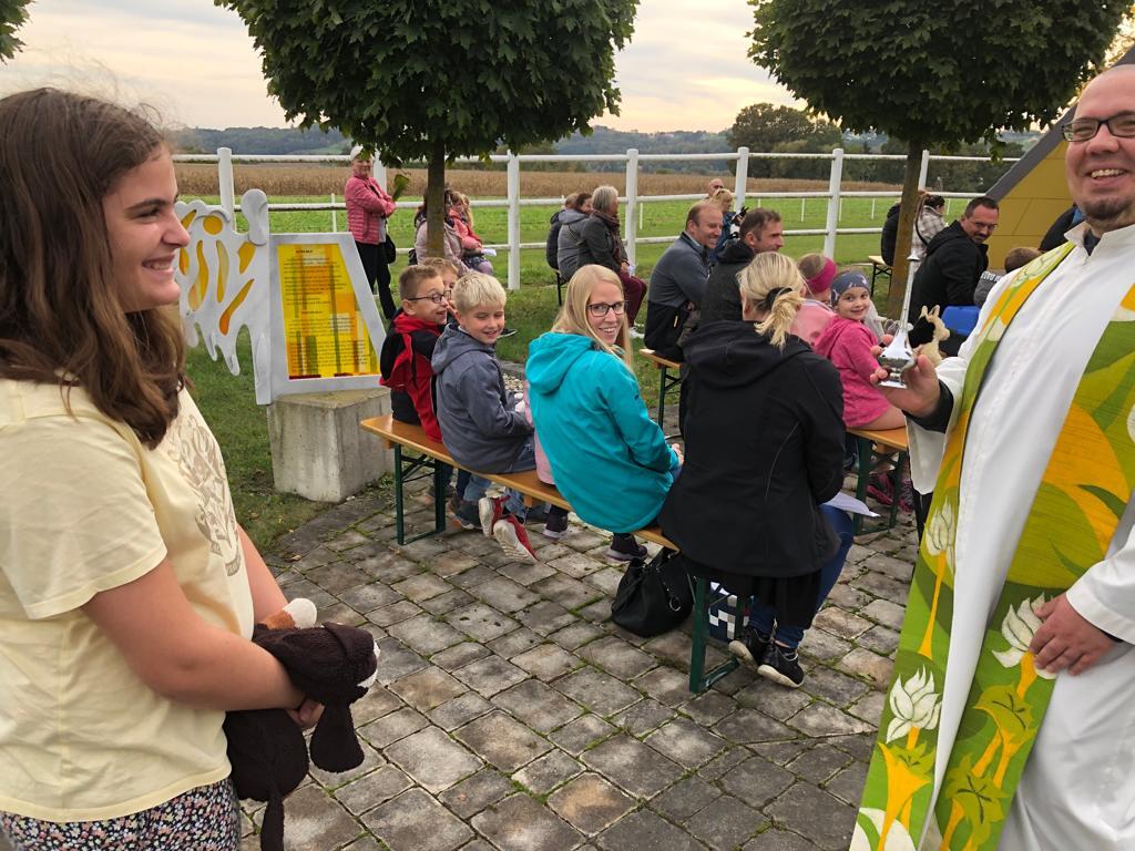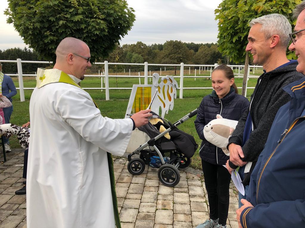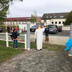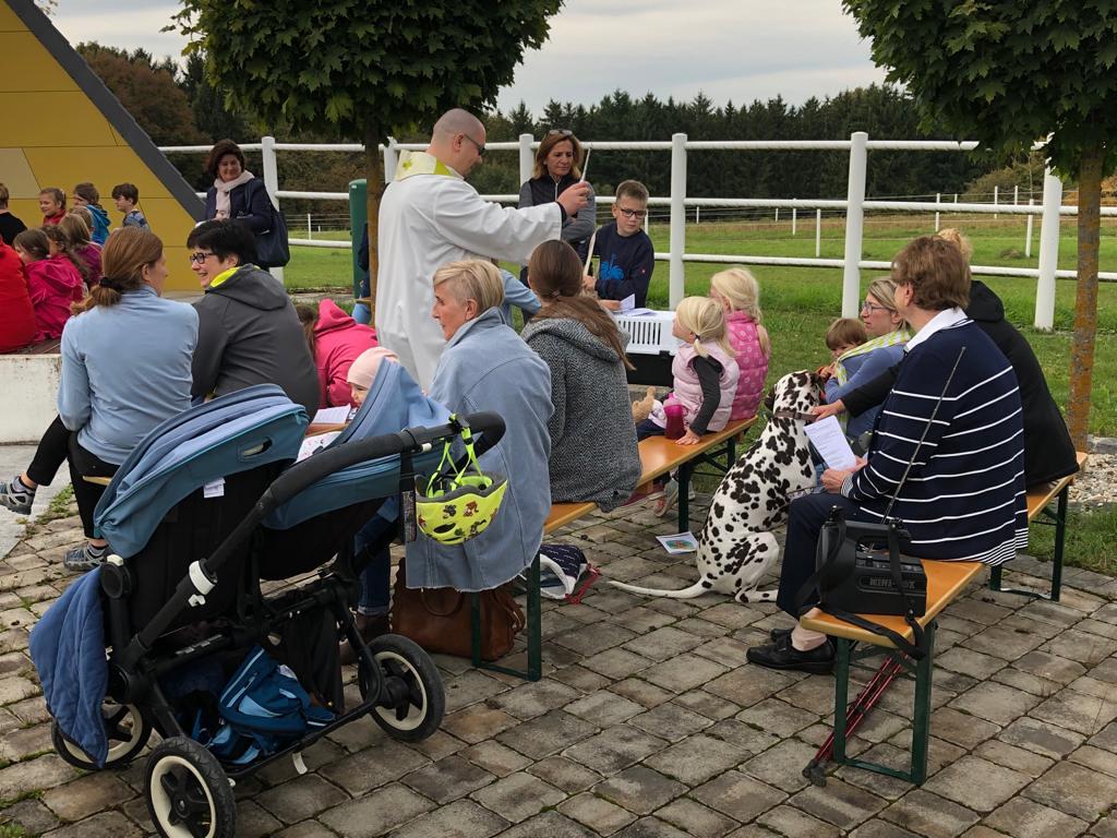 Hunde, Katzen, Hasen und weitere Tiere sowie alle Arten von Stofftieren fanden sich gemeinsam mit ihren Besitzern am 5. Oktober bei der Kreuzkapelle der Familie Jandrisic ein. Die Tiersegnung rund um den Gedenktag des Hl. Franz von Assisi und Welttierschutztag bei dieser besonderen Kapelle umgeben von einer Pferdekoppel hat schon Tradition. Wie in den Vorjahren kamen auch heuer wieder viele Zwei- und Vierbeiner, um sich den Segen von Pfarrer Thorsten Carich zu holen. Pastoralassistentin Sandra Krammer hatte die kindgerechte Gestaltung vorbereitet und die Gastgeberinnen Silvia und Sonja Jandrisic luden anschließend zu einer kleinen Stärkung ein. Vergelt's Gott!