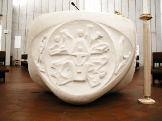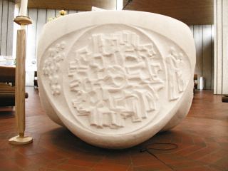 Die Ausstattung der Kirche erfolgte mit Bildhauerarbeiten von THOMAS RESETARITS (die folgenden Beschreibungen folgen seinen Erklärungen). Der Altar aus Laaser Marmor ruht auf drei Standflächen, die als Symbol für die Trinität gelten, die Tischfläche bildet ein Kreis als Zeichen der Einheit im Heiligen Geist. Die senkrechten Flächen schmücken drei Reliefs, die augenähnliche Form haben und das Heilswerk Gottes widerspiegeln sollen.