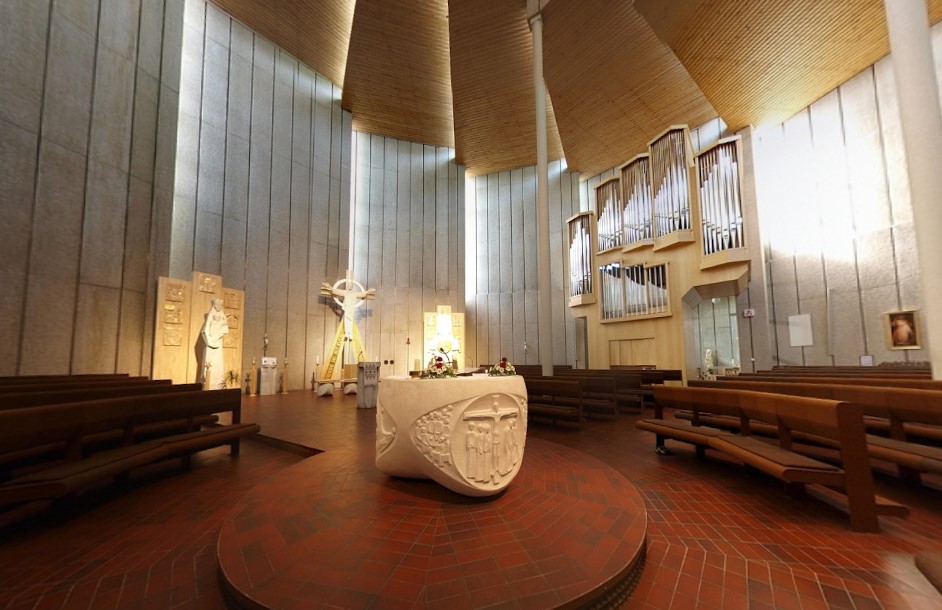 Die Bauform lässt sich als eine Vielzahl von Segmenten im Grundriss bzw. Stufen in der Ansicht charakterisieren, die durch vertikale und horizontale Glasflächen getrennt sind, deren Anordnung wiederum eine gleichmäßige Beleuchtung zu jeder Tageszeit ermöglicht, ohne dassdie Glasflächen selbst sichtbar sind. Der Altarbereich, der das meiste Licht erhält, wurde abgesenkt, um von jedem Platz der Kirche aus auch die „optische Teilnahme" an der Liturgie zu gewährleisten. Entsprechend der Form des Raumes wurden auch die Bänke angeordnet, die 380 Personen Sitzgelegenheiten bieten. Dazu kommen noch rund 400 Stehplätze.