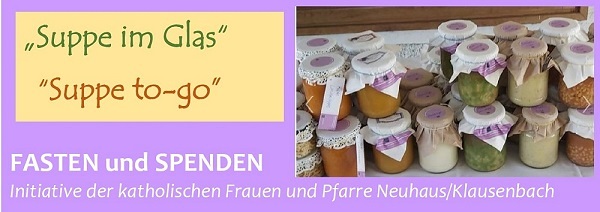 Am Sonntag, dem 15. März 2026, können Sie von 9.30 – 10.00 Uhr und von 11.00 – 11.30 Uhr, also vor und nach der hl. Messe, hausgemachte Suppenvariationen im Glas gegen eine Spende mit nach Hause nehmen.